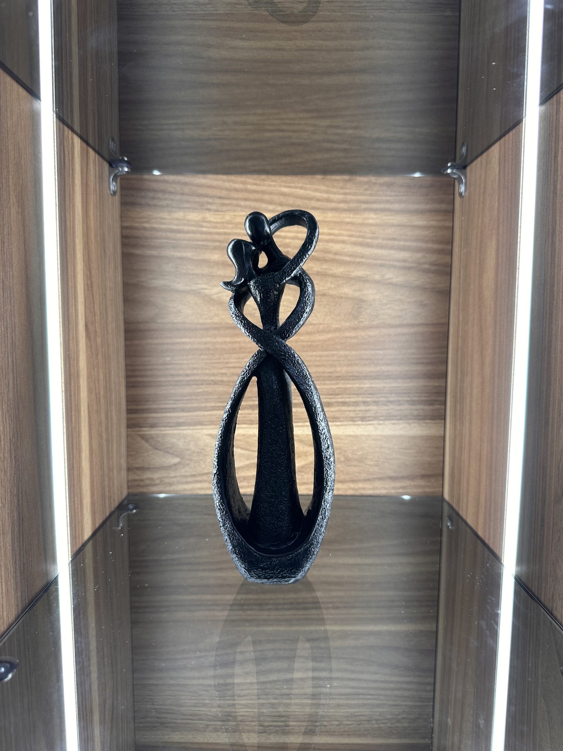 Elegant black resin sculpture symbolizing love and unity, featuring two figures intertwined in a modern abstract design. A timeless decorative piece perfect for home, office, or as a meaningful gift.