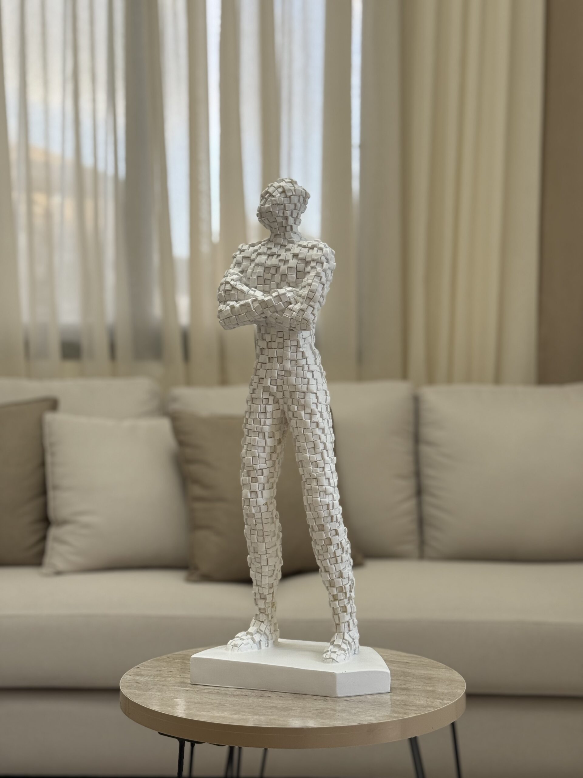 A striking large resin sculpture designed with a unique pixel-like texture, available in bold black and white. This modern art piece embodies strength and elegance, making it a standout addition to contemporary home decor.