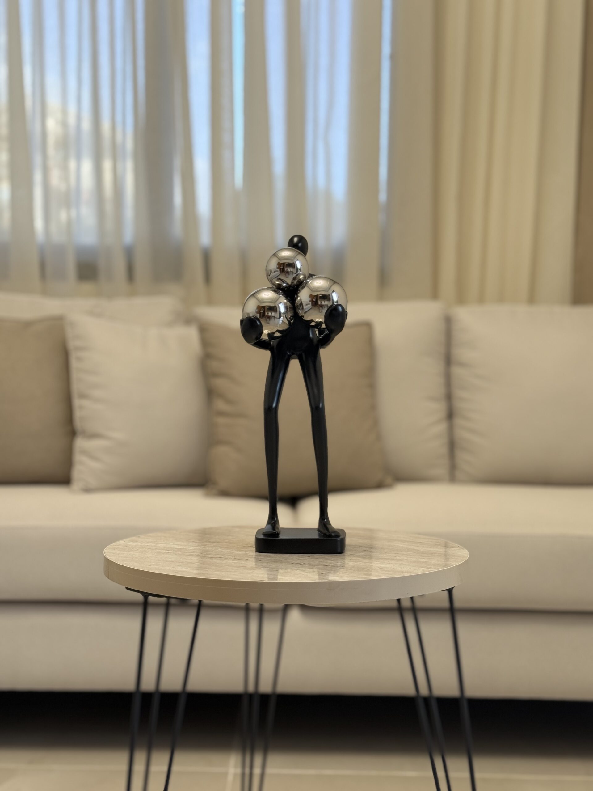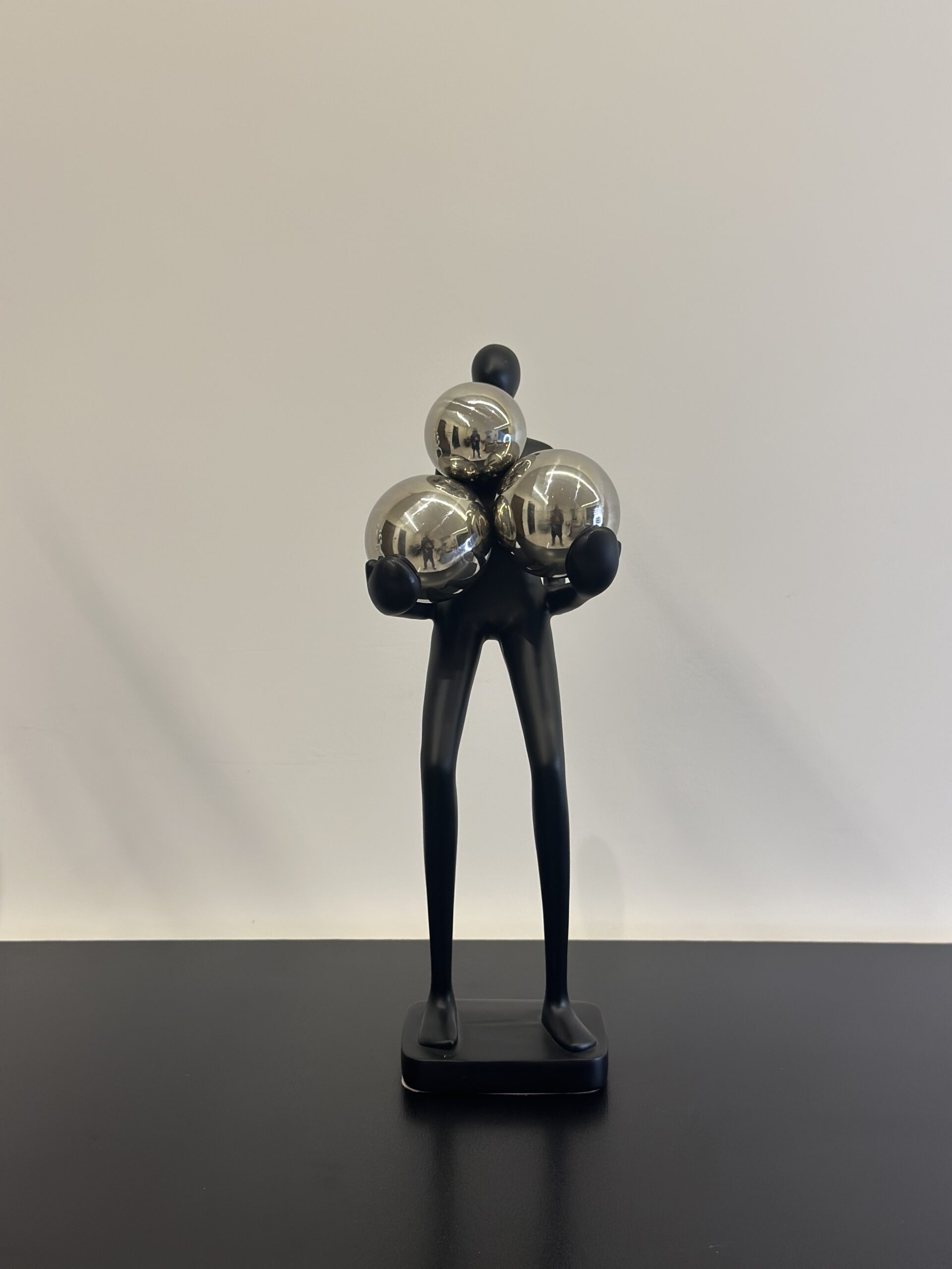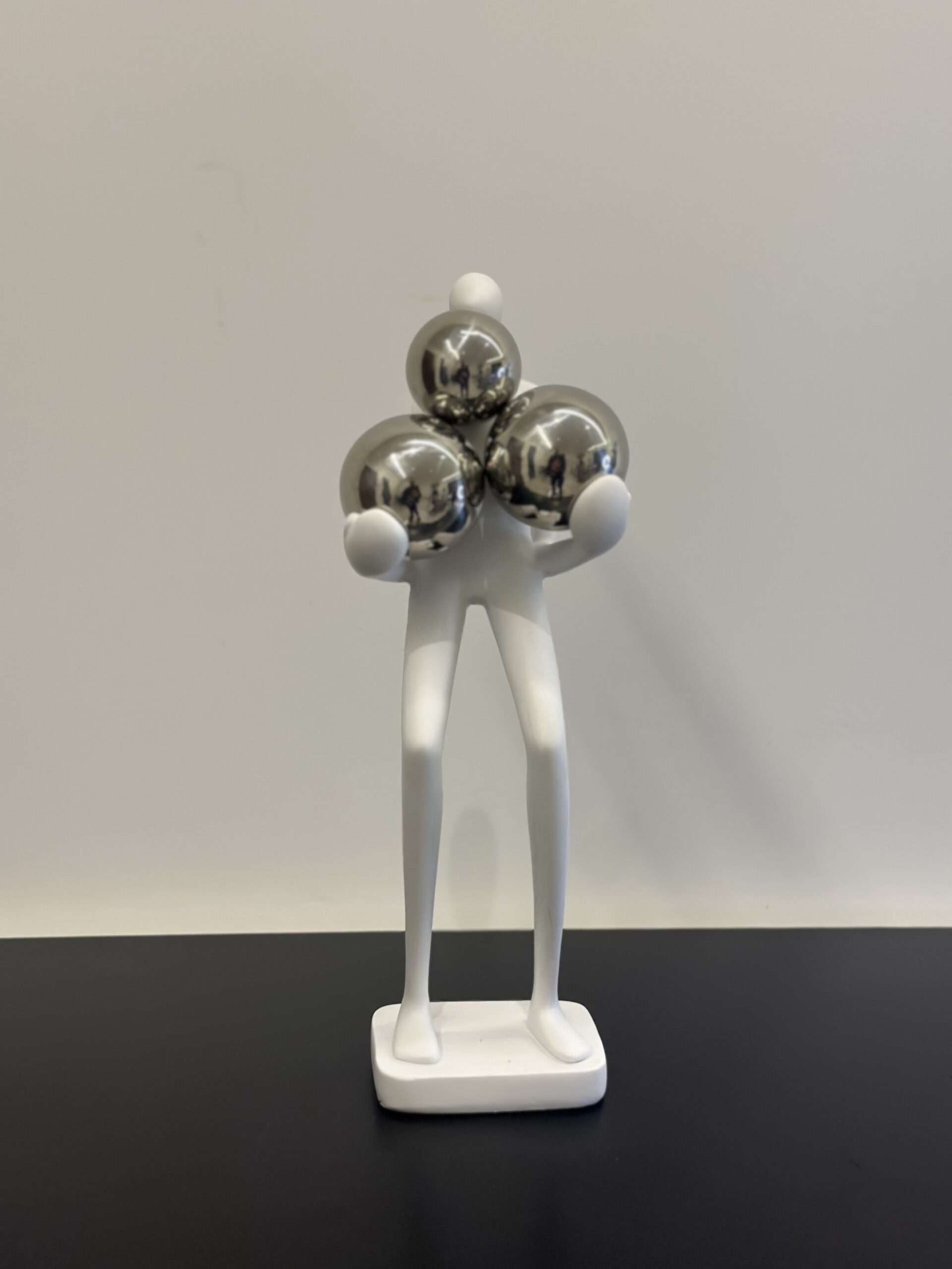 A sleek and artistic resin sculpture of a faceless figure in white & black, carrying three reflective silver spheres. This modern piece blends simplicity with elegance, symbolizing balance, strength, and contemporary design — a perfect statement decor for living rooms, offices, or art-inspired spaces.