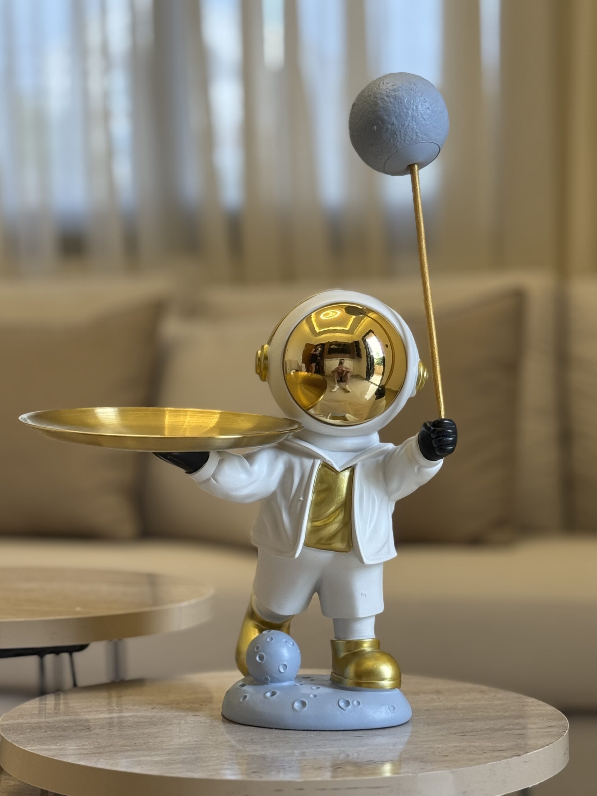 Elevate your space with the Astro Duo Tray Holders, a stunning set of modern astronaut sculptures available in gold and white. Crafted from high-quality resin with a sleek metallic finish, each piece features a tray balanced gracefully on one hand — perfect for holding keys, candles, or decorative accents. A blend of futuristic art and functionality, ideal for any modern home or office decor.