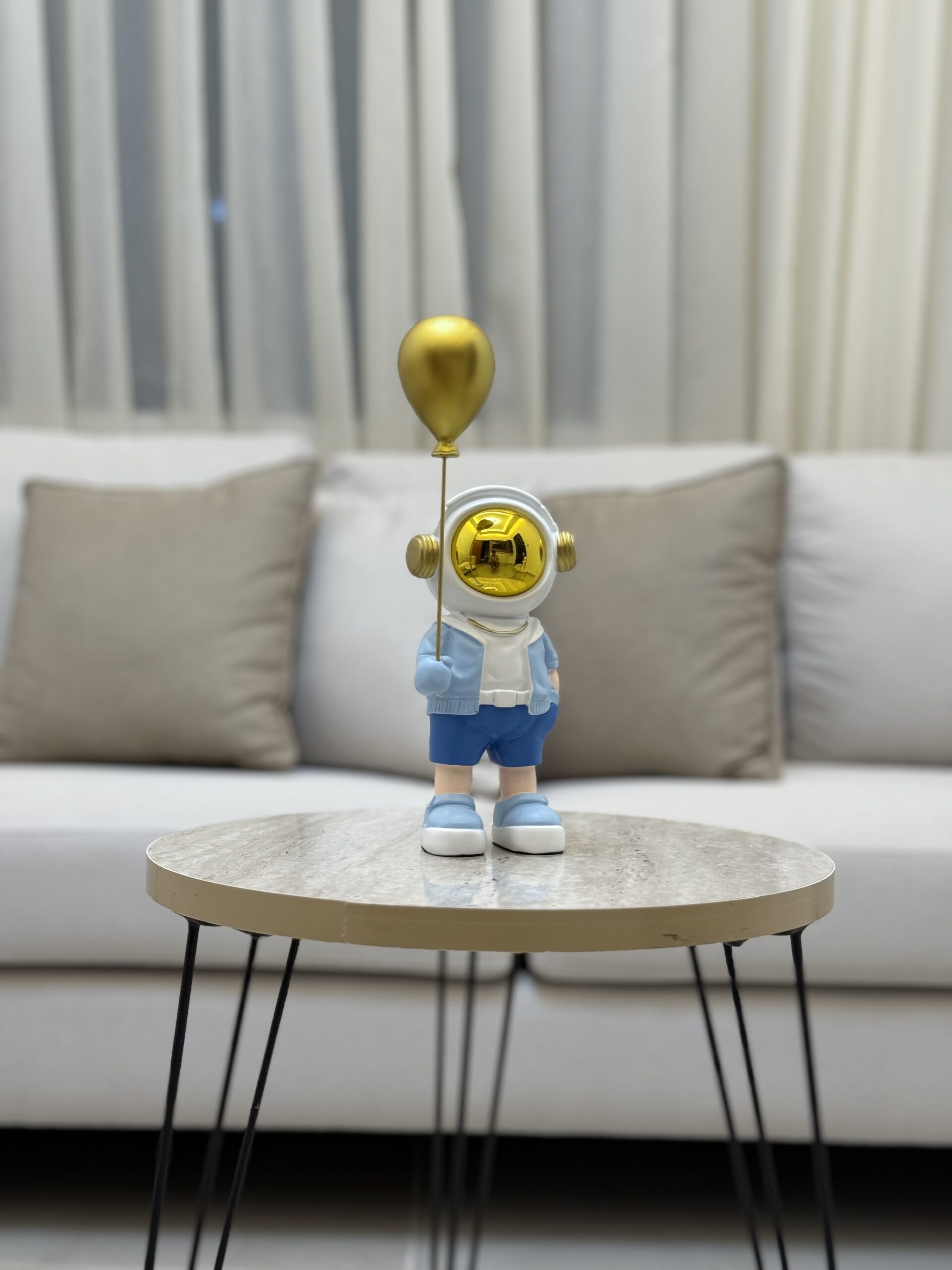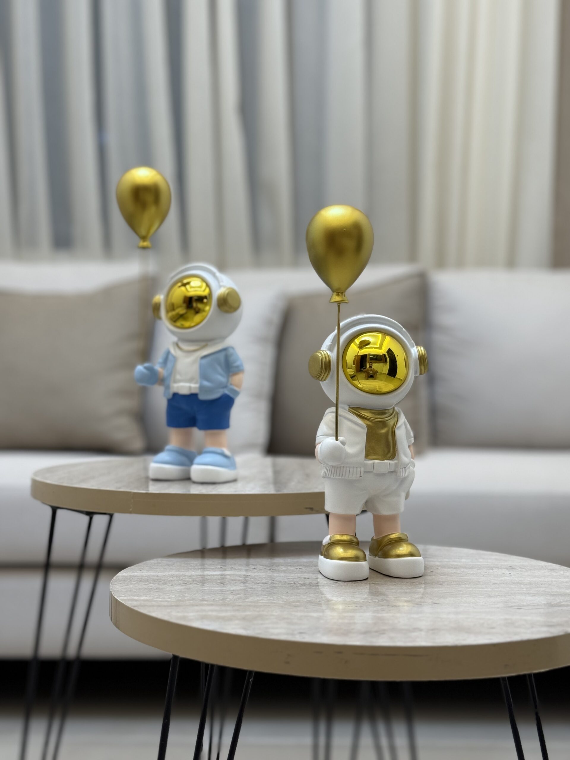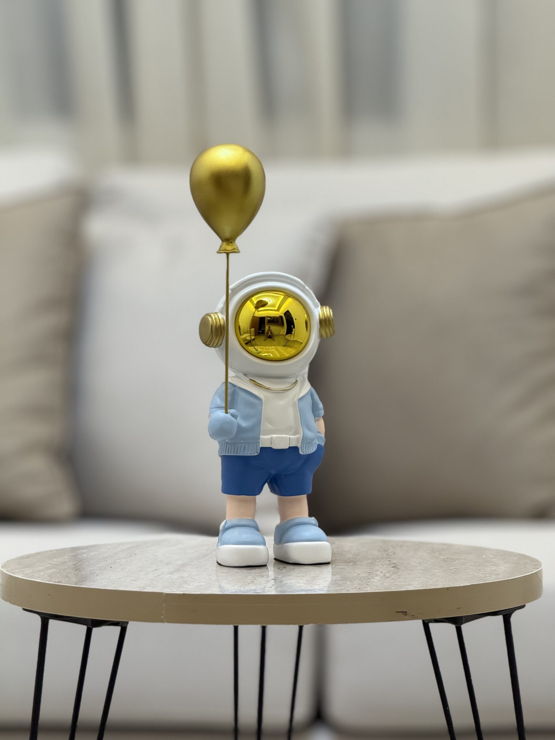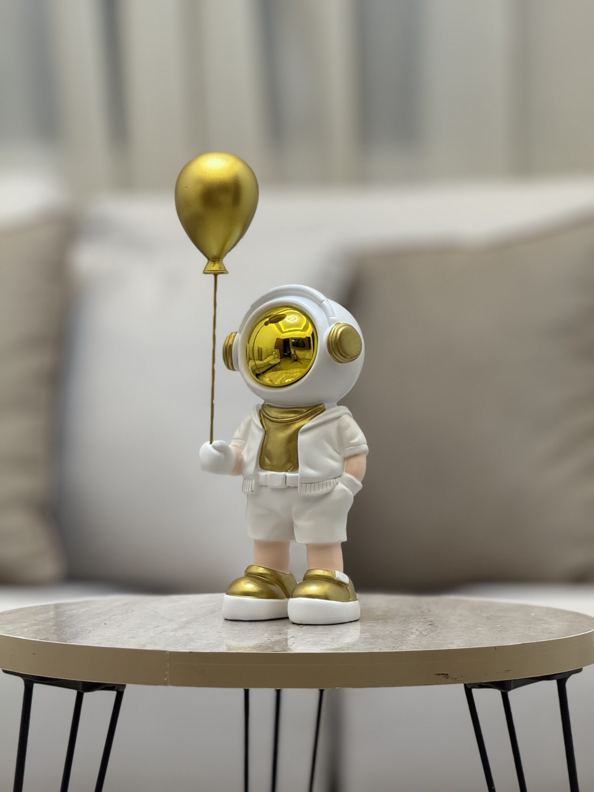 High-quality resin astronaut figurine holding a golden balloon, available in two stylish color options. A modern and playful decorative piece that adds a unique cosmic touch to any space.