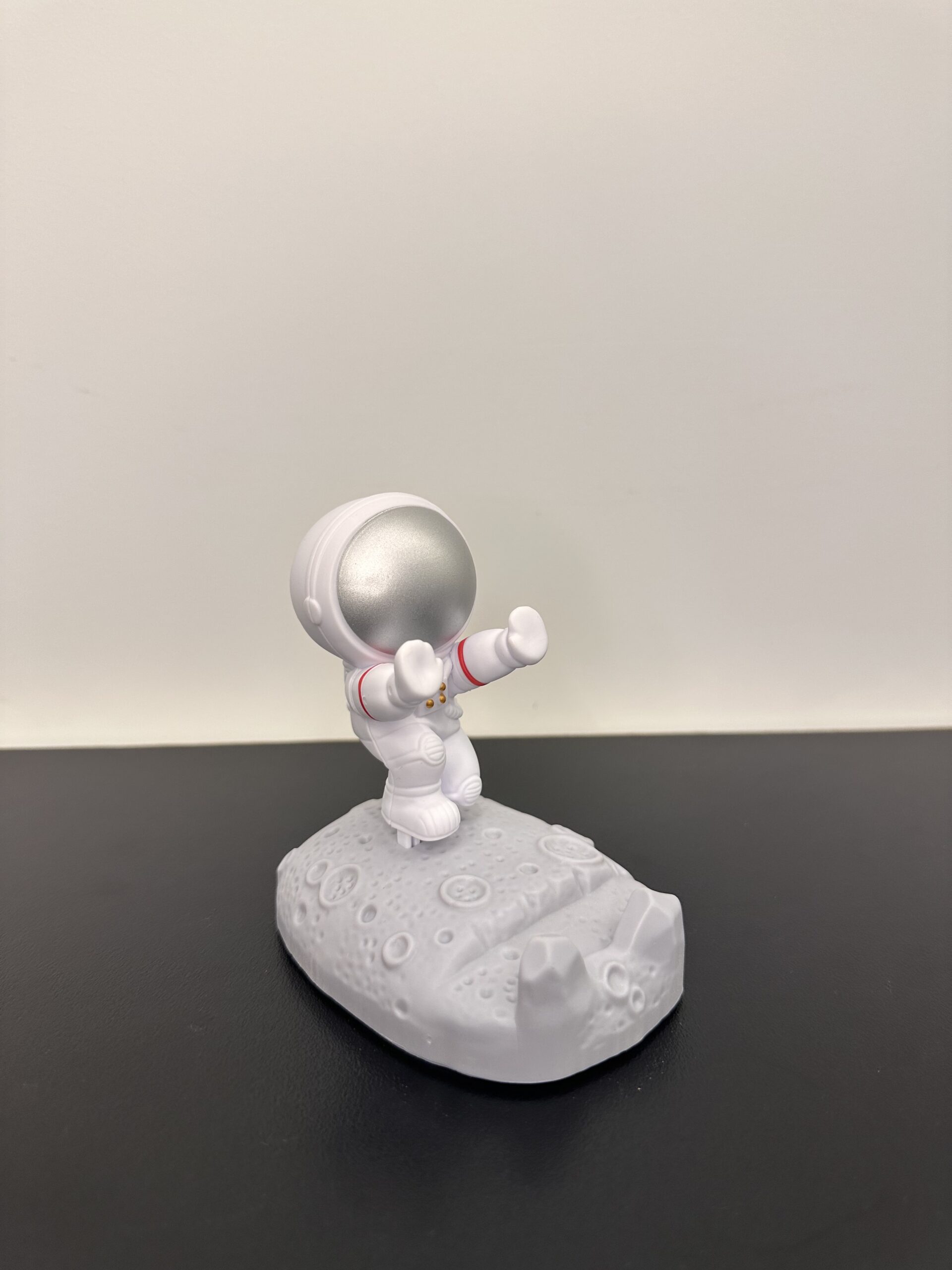 A fun and functional phone holder featuring a seated astronaut resting on the moon, hands outstretched to securely hold your device. A perfect blend of space-themed charm and everyday convenience for your desk or nightstand.