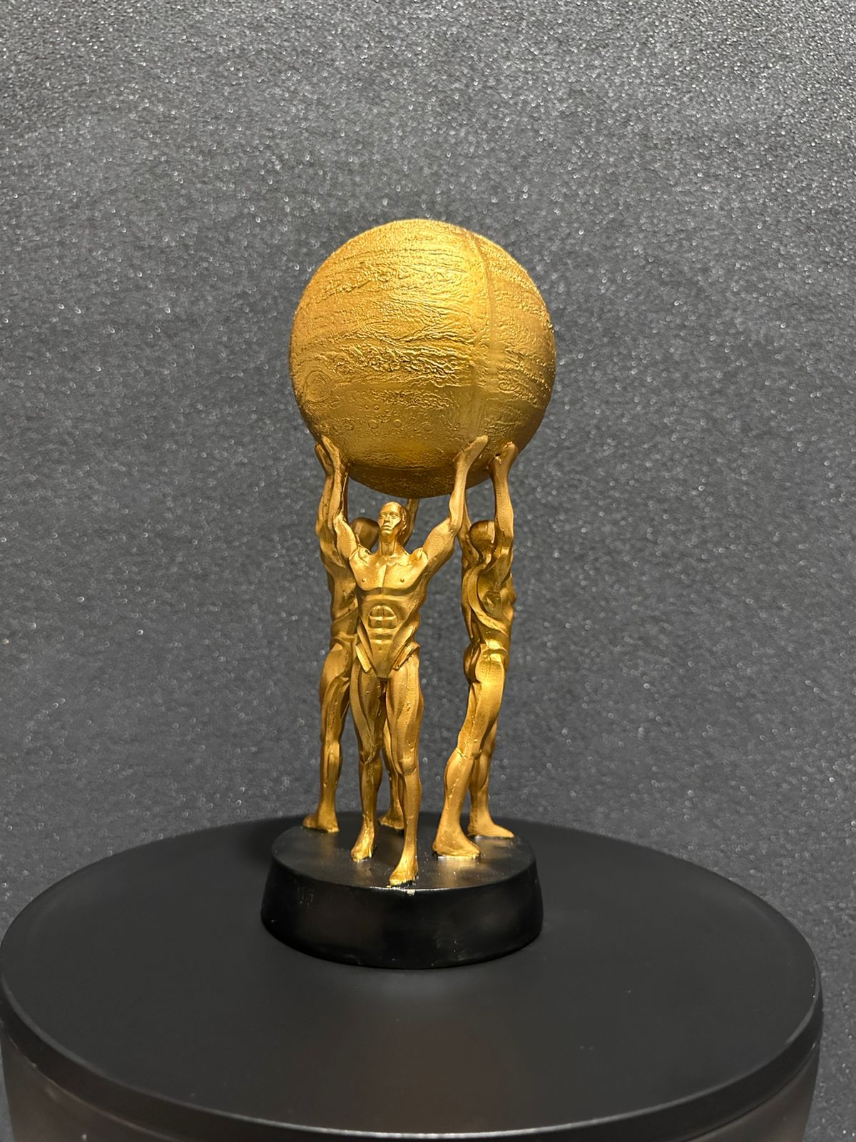 Three muscular male figures stand back-to-back, arms raised to support a golden globe above them. Cast in resin with a striking gold finish, the sculpture rests on a contrasting matte black square base—symbolizing strength, unity, and balance. A bold centerpiece for modern or classic interiors.