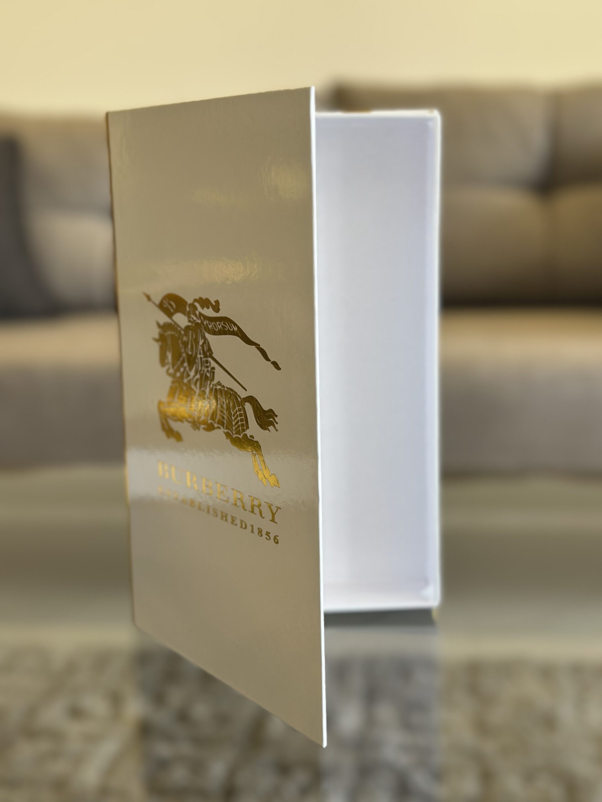 This elegant decorative book features a luxurious Burberry-inspired design with a sleek white cover, gold foil detailing, and the iconic equestrian logo. Perfect as a stylish accent piece for coffee tables, shelves, or modern interiors, it adds a touch of sophistication and timeless fashion charm to any space.