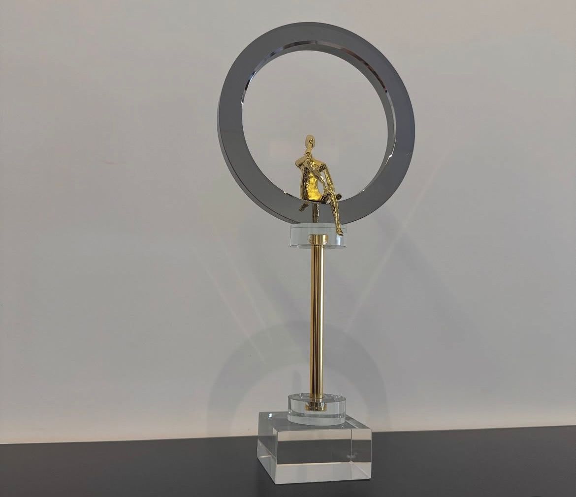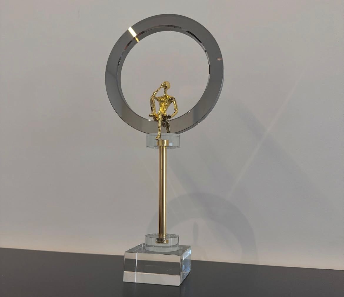 A captivating blend of elegance and modern design, this resin sculpture features a golden figure seated peacefully within a sleek silver ring. The entire piece is beautifully elevated by a cylindrical golden column, all resting on a clear crystal base that adds a touch of sophistication and light. A stunning accent for shelves, desks, or display areas — perfect for those who appreciate art that inspires reflection and serenity.