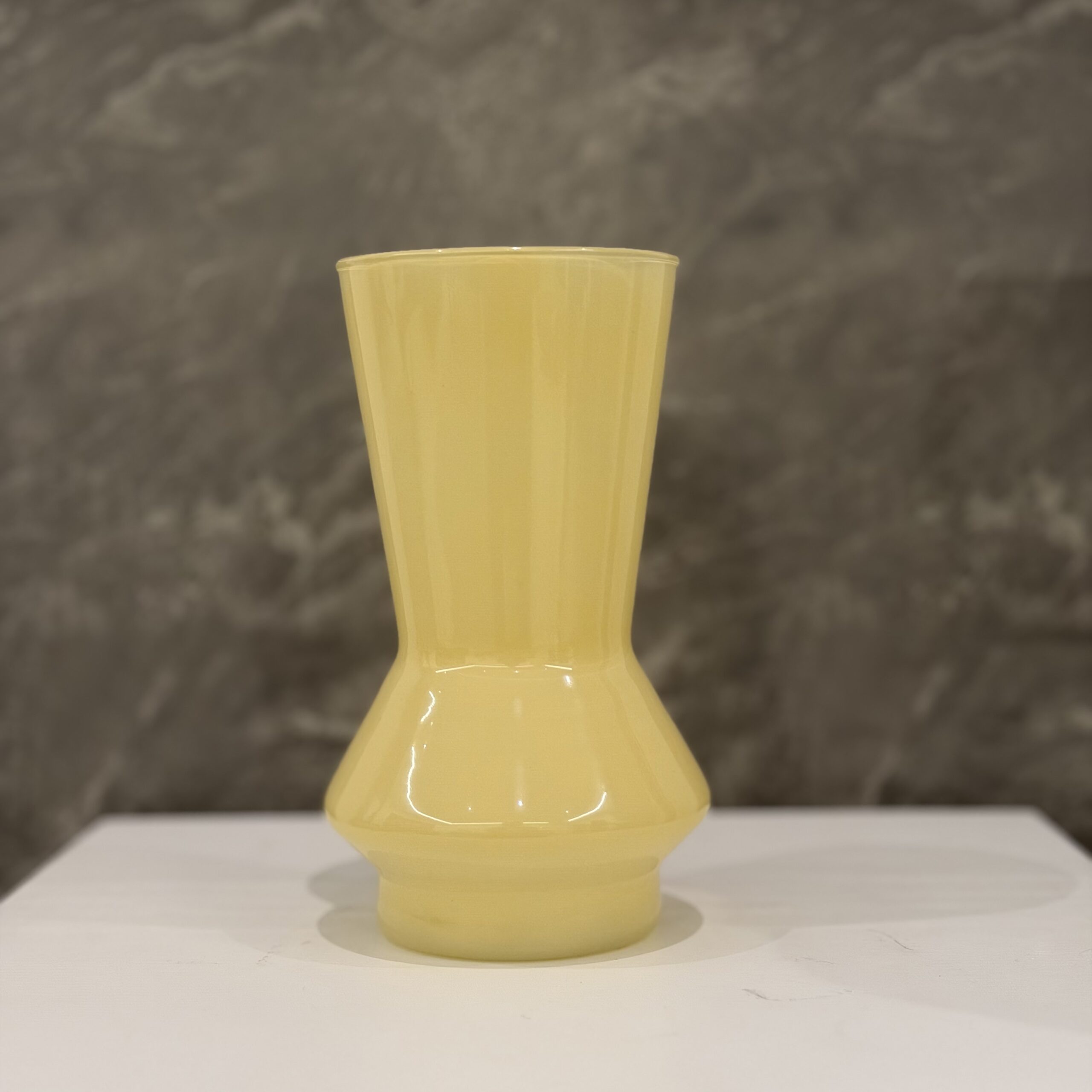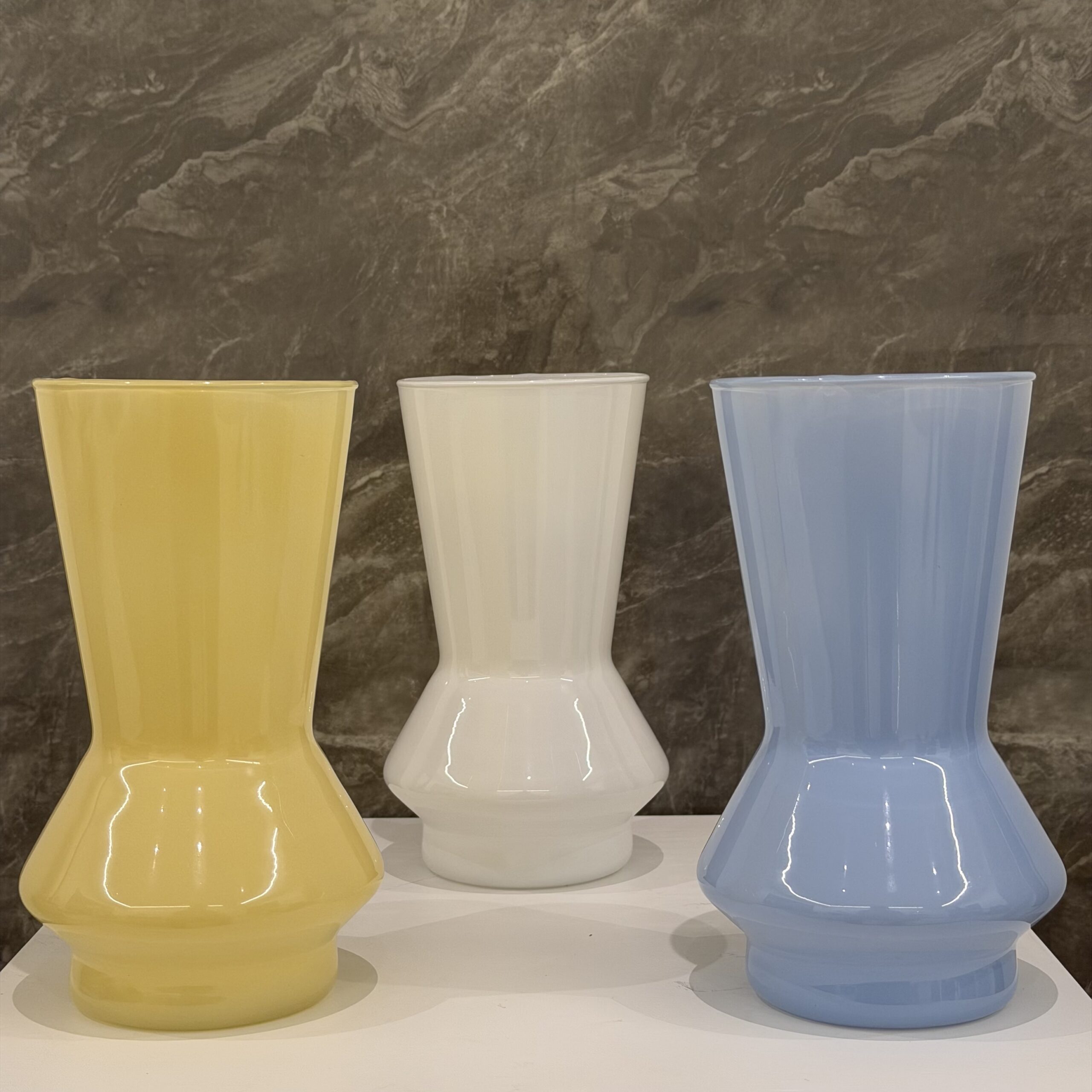 Elegant glass vases available in yellow, white, blue and clear.