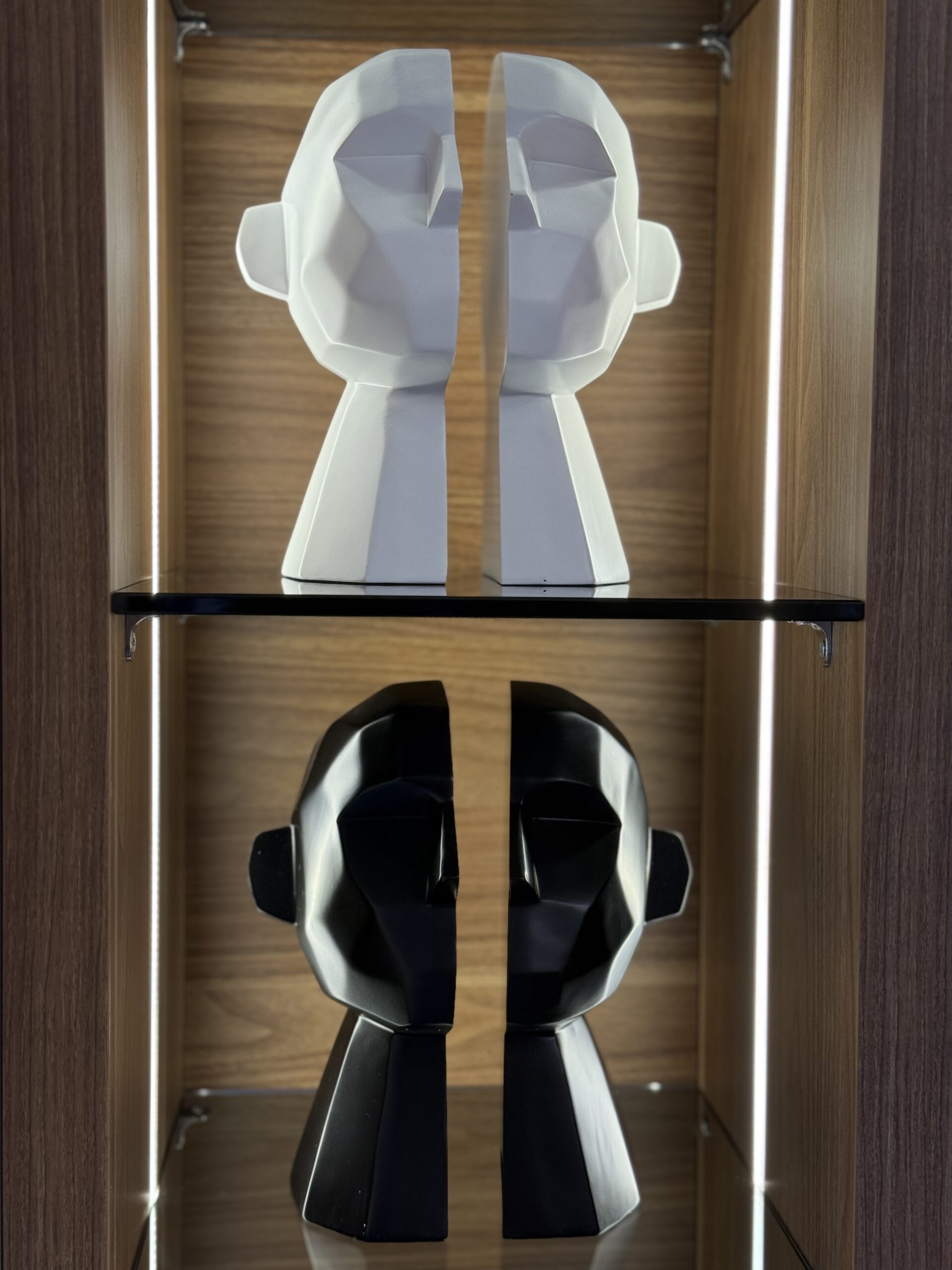 A striking resin sculpture featuring a faceless, detached head design. Available in sleek black and white, it adds a bold, modern touch to any living space, perfect for contemporary home decor.
