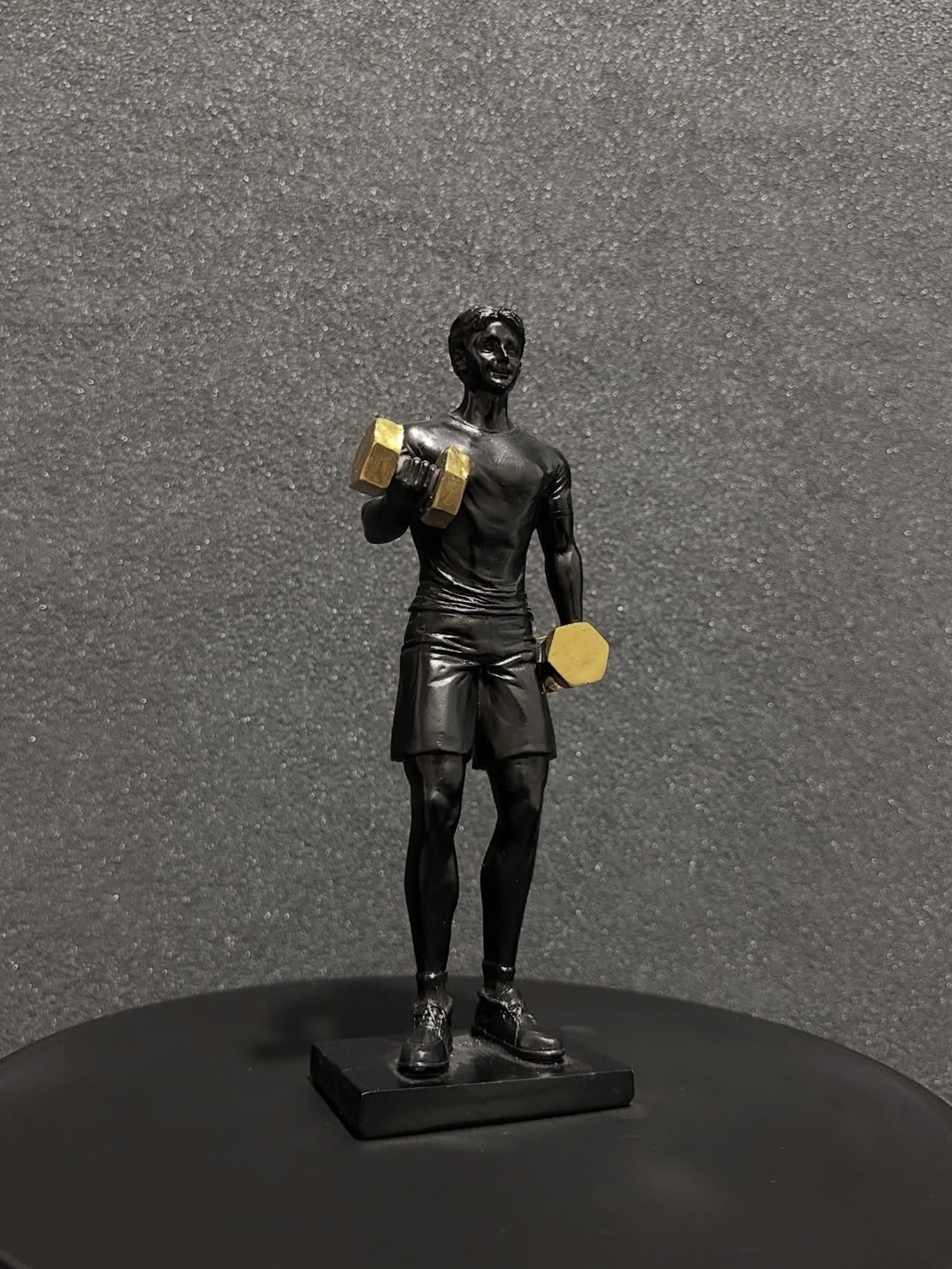 A sleek black resin figure captured mid-workout, lifting golden dumbbells in an alternating bicep curl. This modern sculpture symbolizes discipline, power, and dedication—perfect for fitness enthusiasts or contemporary decor with an edge.