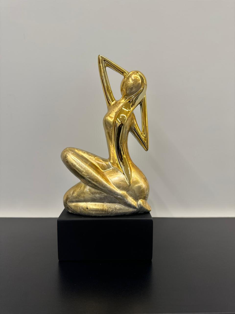 An elegant abstract resin sculpture of a seated female figure in a graceful pose, finished in a radiant gold tone. This piece embodies serenity, beauty, and fluid form—perfect for adding a touch of luxury and sophistication to any interior space.