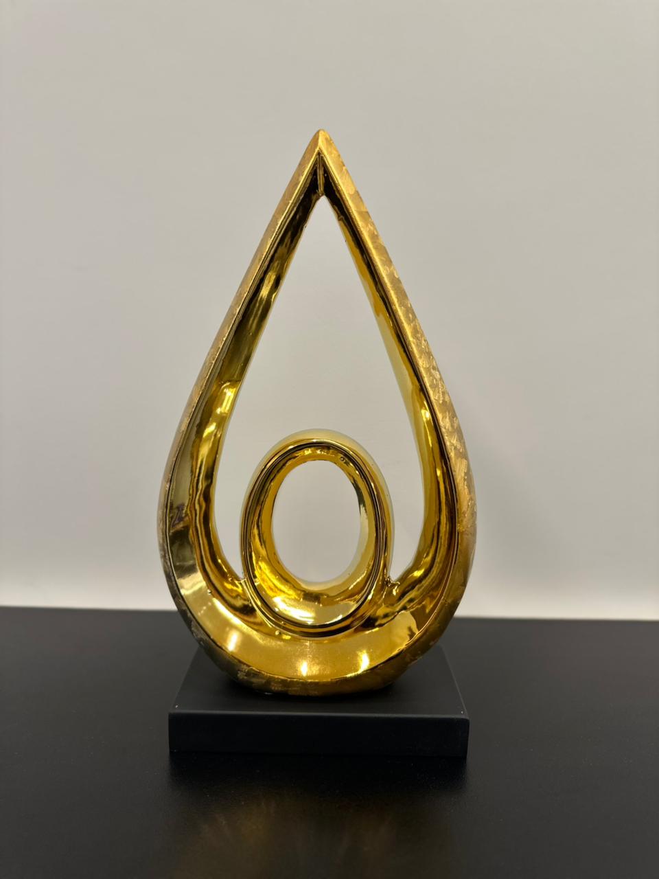 A modern golden resin sculpture featuring a hollow teardrop frame with a suspended ring-shaped accent inside. Sleek, elegant, and perfect for contemporary décor.