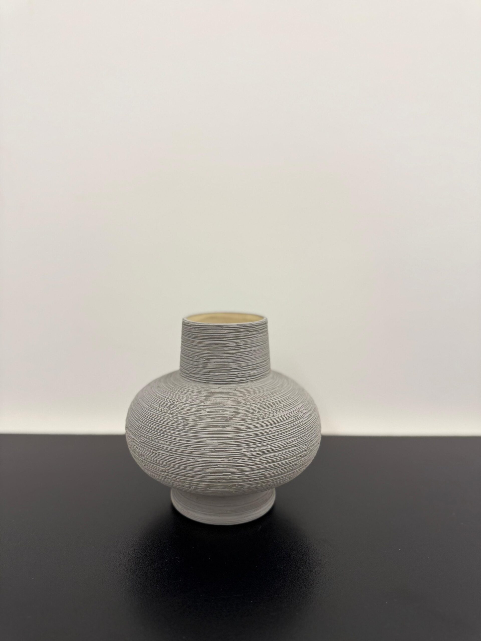 A modern ceramic grey brushed vase featuring a bold, wide circular base and a sleek tubular opening. Its unique silhouette combines stability with elegance, making it a standout piece for any contemporary space.