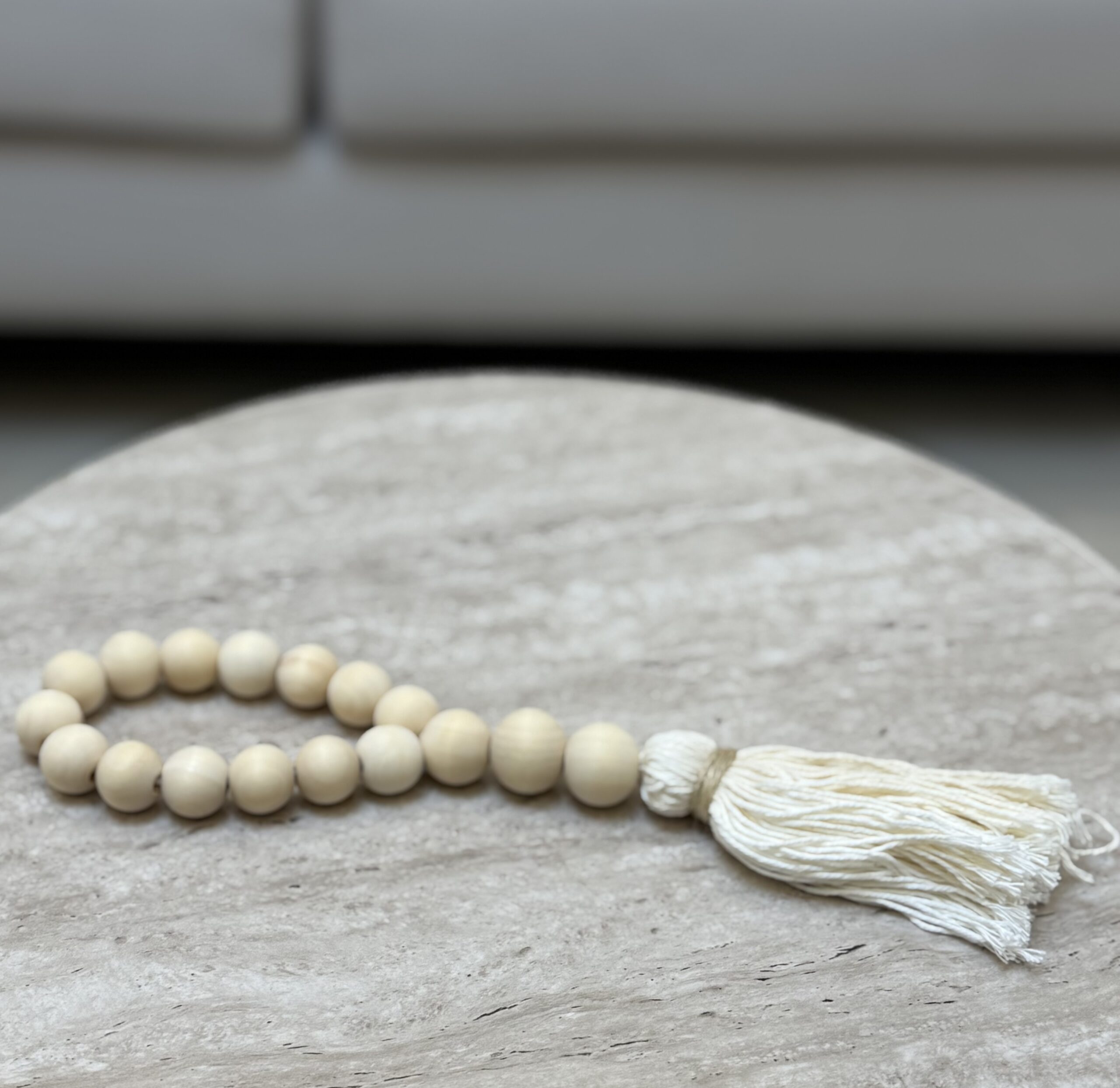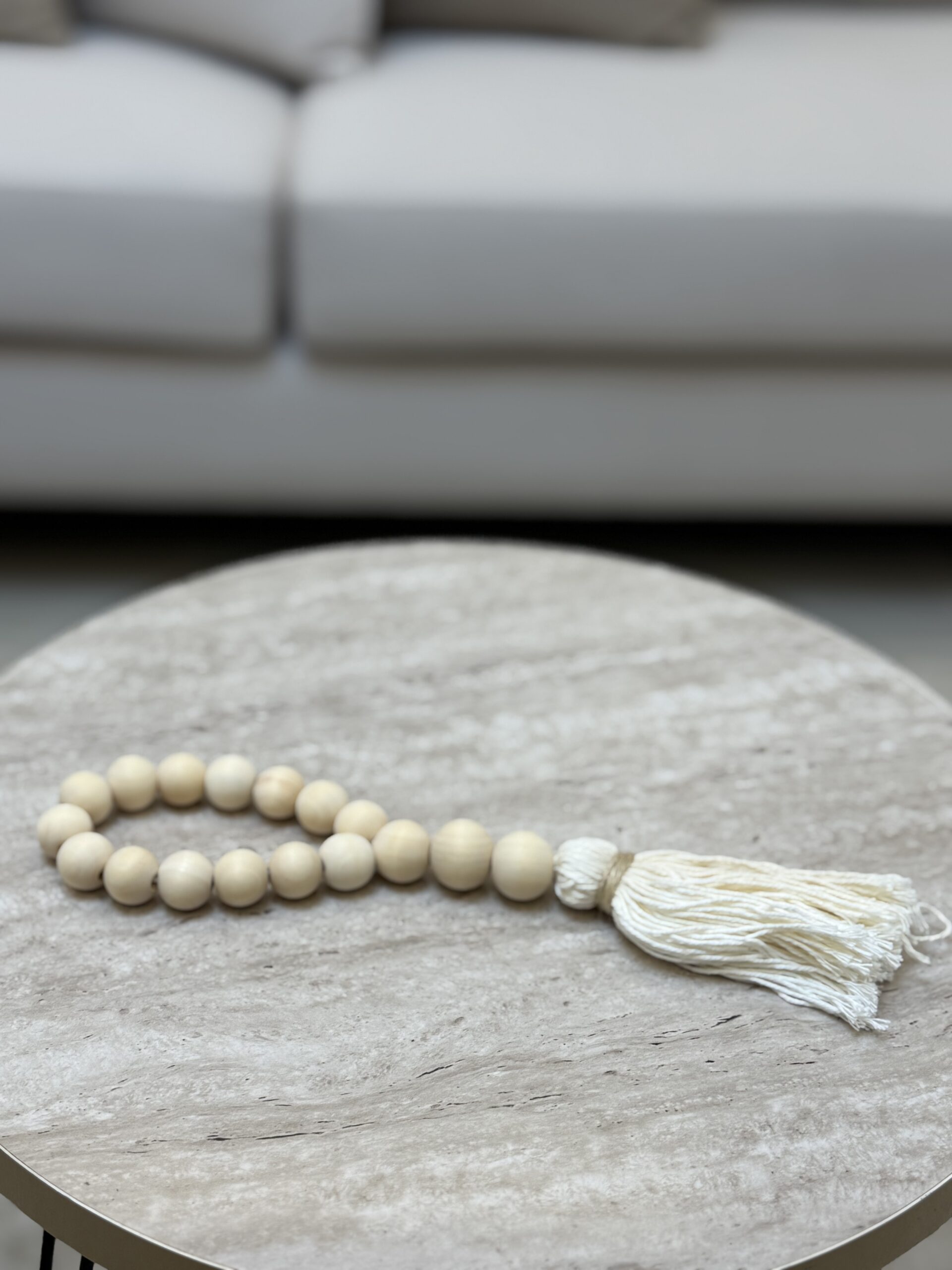 A soft ivory-toned wooden bead strand finished with a delicate tassel. Perfect for styling trays, coffee tables, or shelves, adding a calm, minimalist touch to neutral interiors.