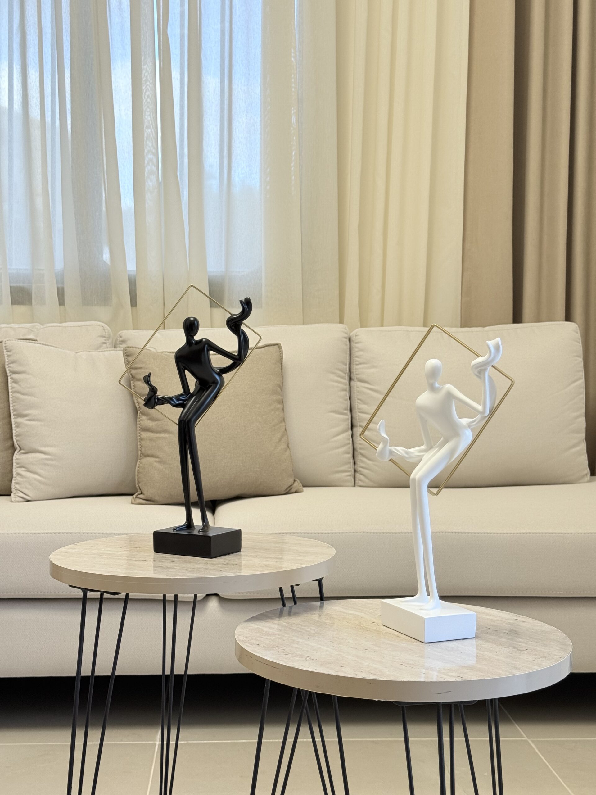 Elegant resin sculpture of a woman holding a frame, available in black and white. A modern décor piece that adds sophistication and artistic charm to any space.