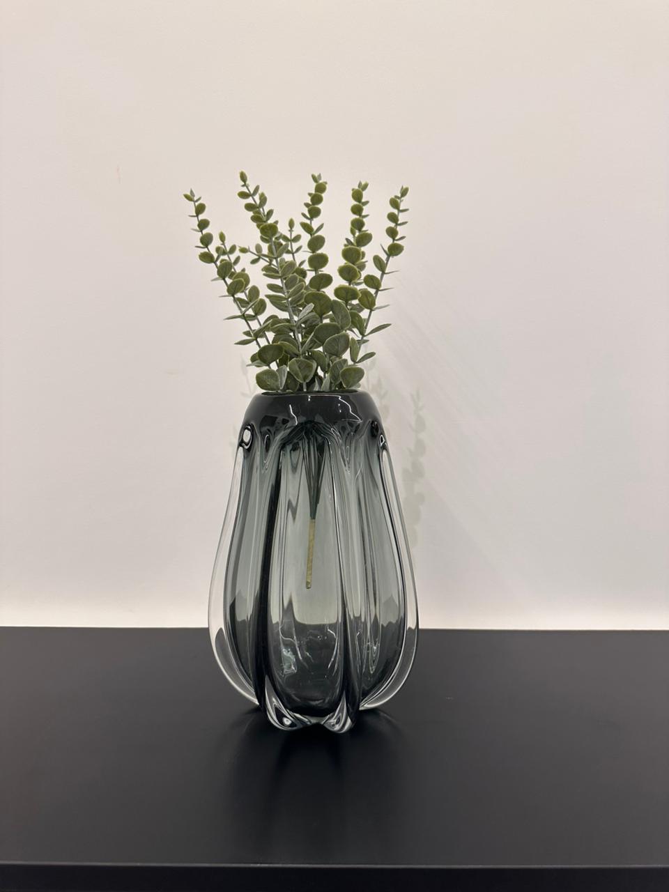 An elegant oval-shaped glass vase crafted from ultra-dark, translucent glass that captures light with mysterious depth. Four sleek, structural edges extend outward from the main body, running from base to rim, adding a bold architectural flair. This piece balances softness and structure—its smooth, shadowy form contrasted by sharp, vertical contours—making it a striking accent in modern interiors or artistic displays.