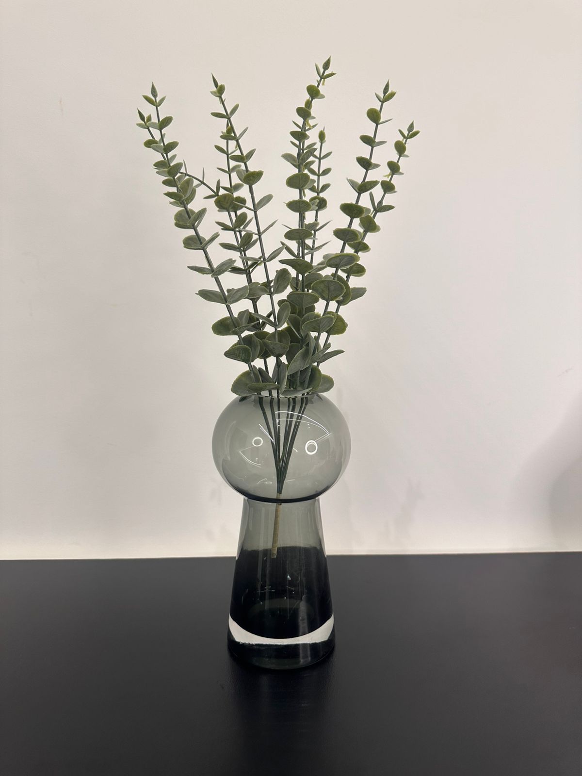 A sleek, hand-blown glass vase in a deep, translucent black. Its subtly tapered body flows into a striking spherical top with a circular opening. A bold yet refined piece that adds sculptural elegance to any modern interior.