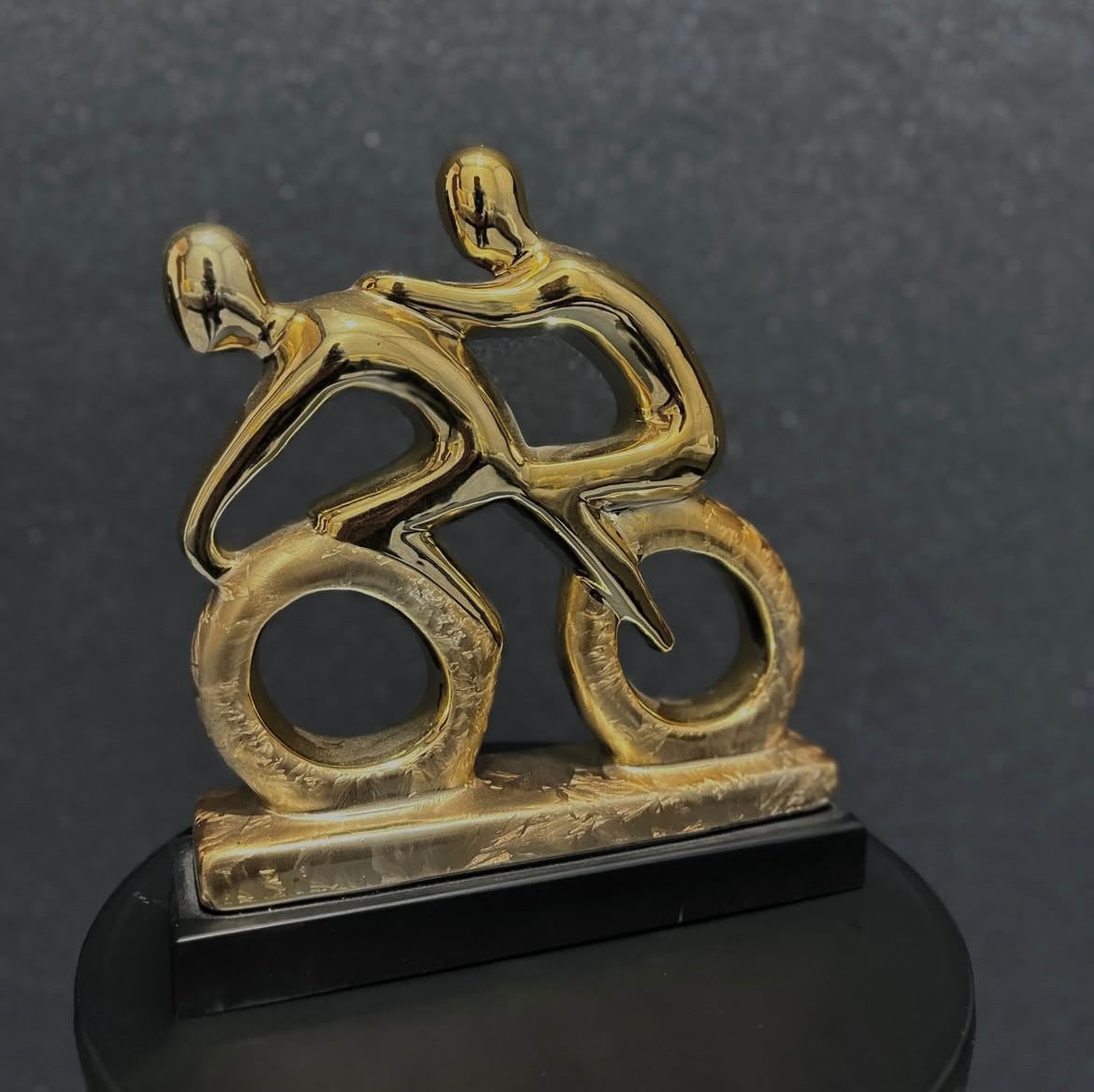 A striking crystal sculpture featuring two abstract gold-toned figures riding in unison. With its smooth finish and modern form, this piece adds movement, elegance, and a touch of luxury to any décor.