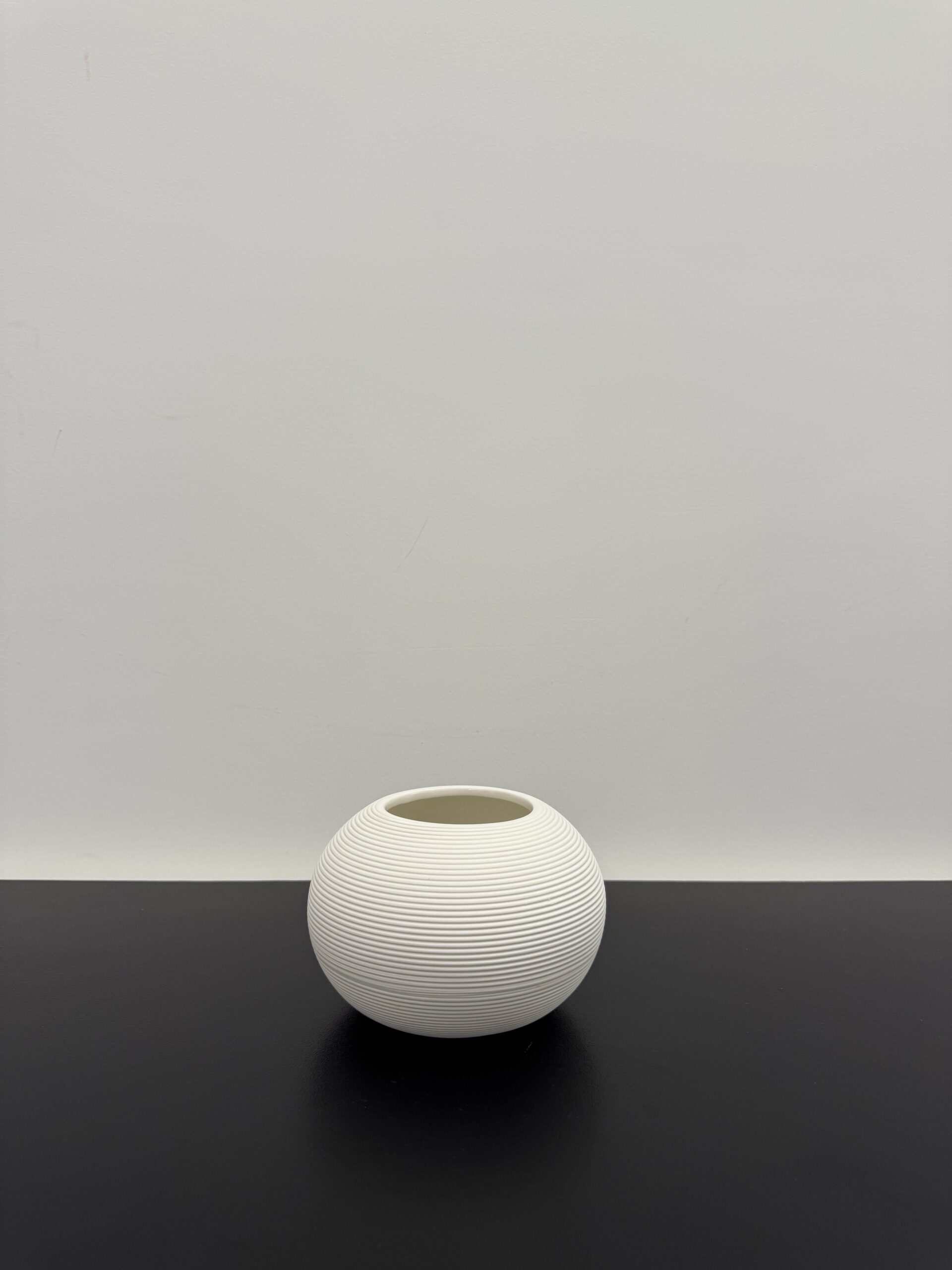 This round ceramic vase features a smooth, ball-shaped design with a subtle striped texture and a small top opening. Finished in clean matte white, it adds a modern, minimalist touch to any space—perfect for dried florals or as a sculptural decor piece.