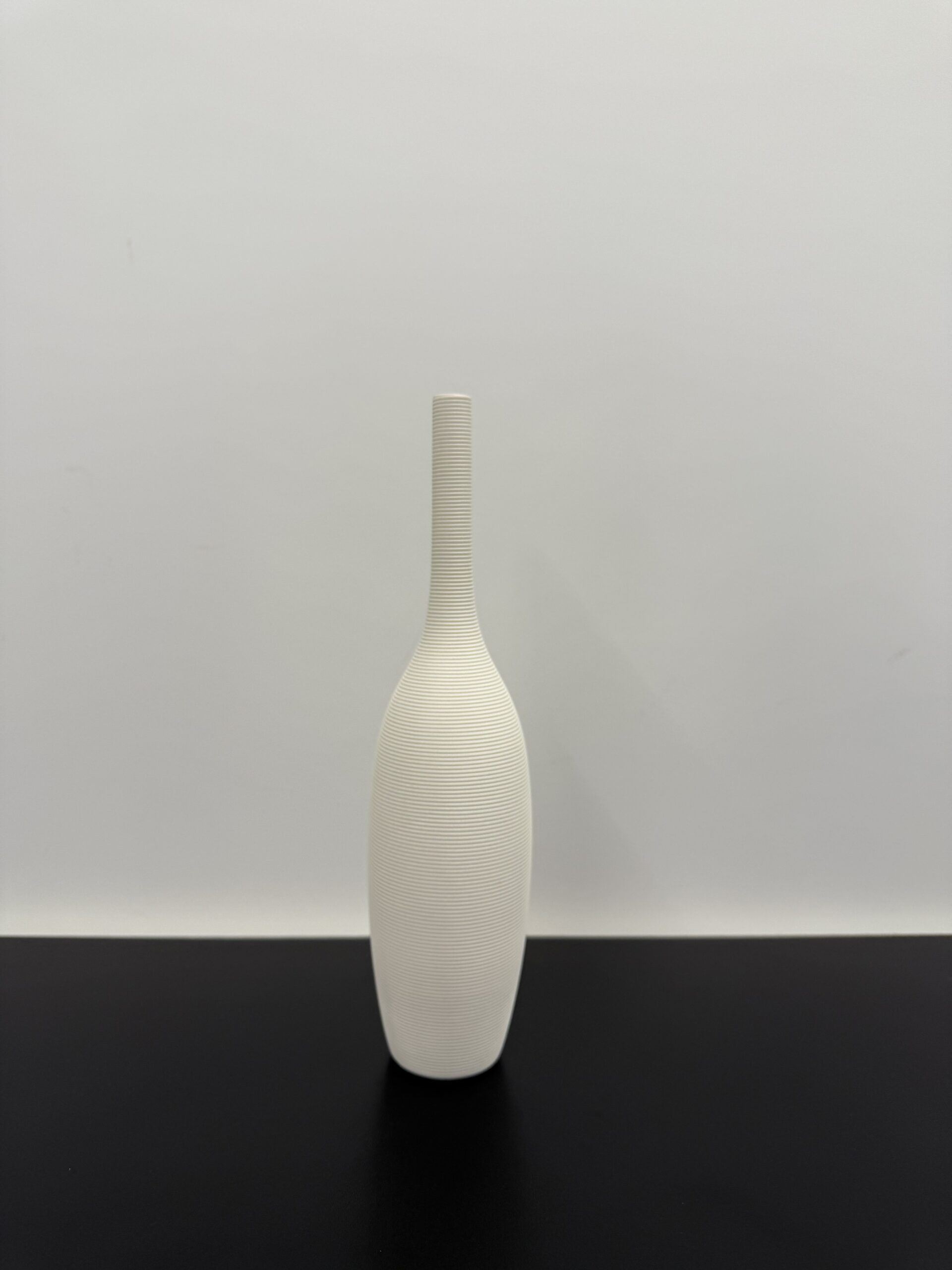 This elegant ceramic vase features a tall, slender profile with finely ribbed detailing, finished in a soft off-white tone. Its minimalist silhouette adds height and sophistication to any setting—perfect for showcasing single stems or as a refined standalone decor piece.