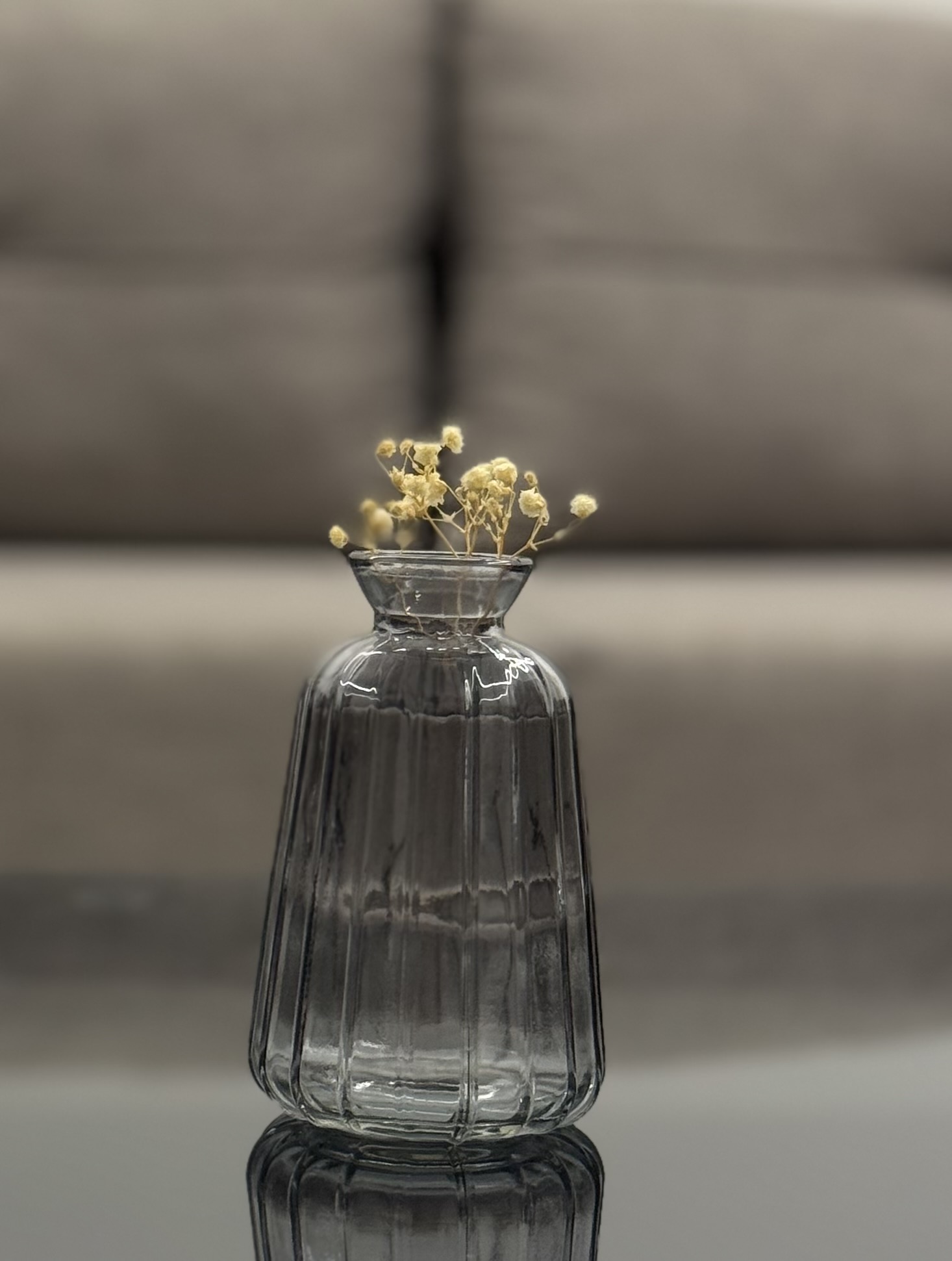 A refined glass vase featuring a gently tapered silhouette and delicate ribbed detailing. Its timeless design makes it ideal for showcasing single stems, dried florals, or simply adding a touch of elegance to any space.