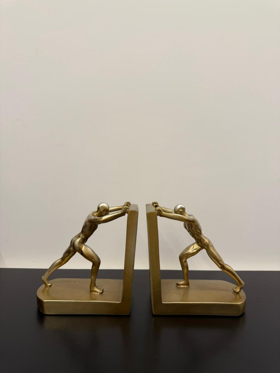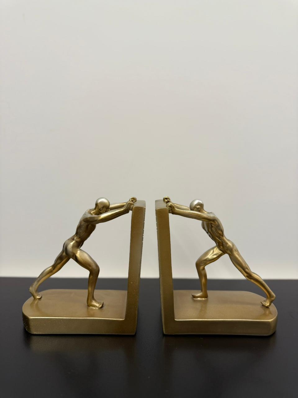 This captivating set of golden resin book stoppers features a stylized human figure bracing against the vertical wall of an L-shaped structure, as if heroically holding your books in place. Symbolizing strength and determination, each bookend blends artistic flair with functional design—making it a standout addition to any modern bookshelf or office space. A perfect fusion of form, symbolism, and utility.