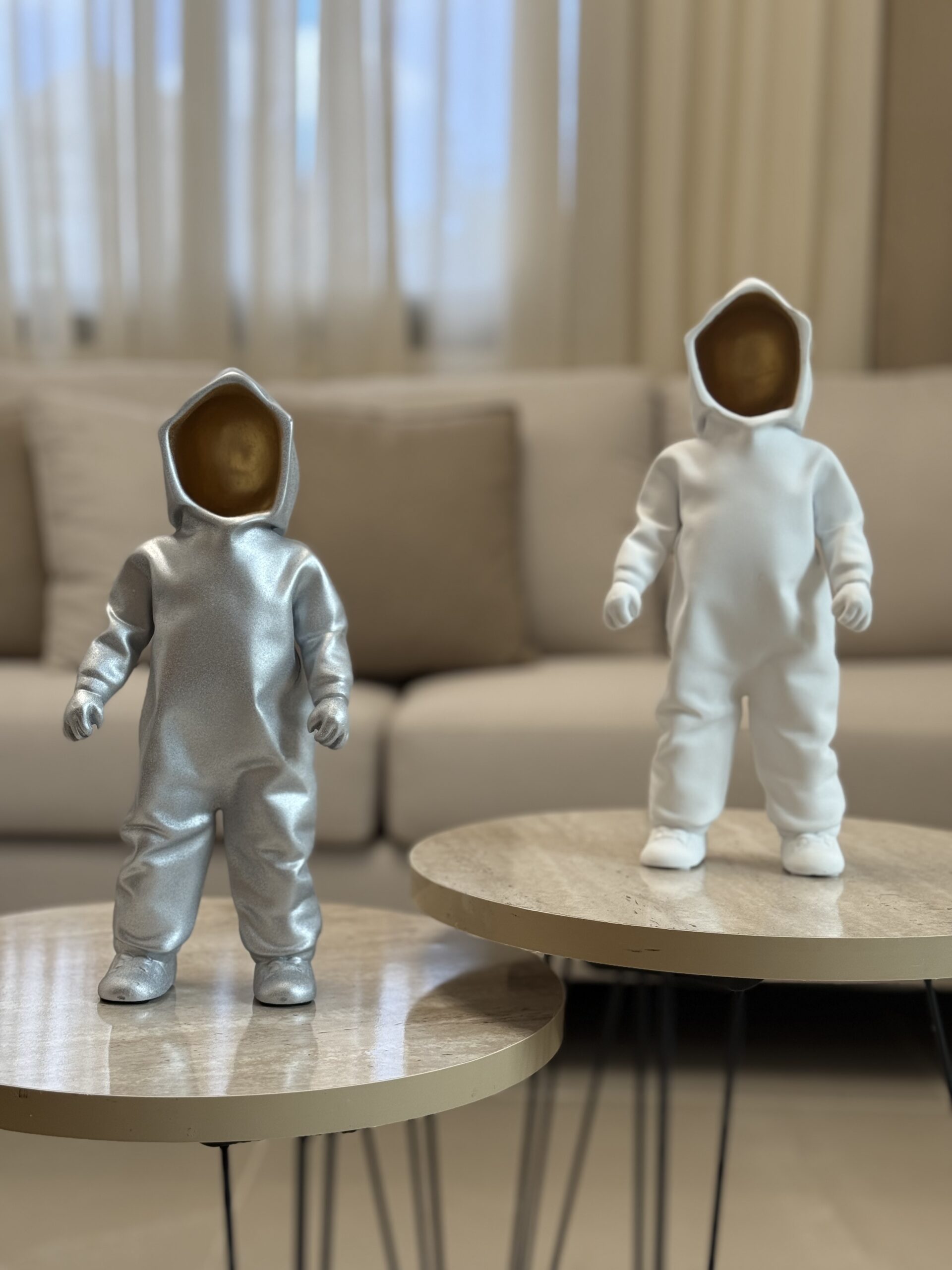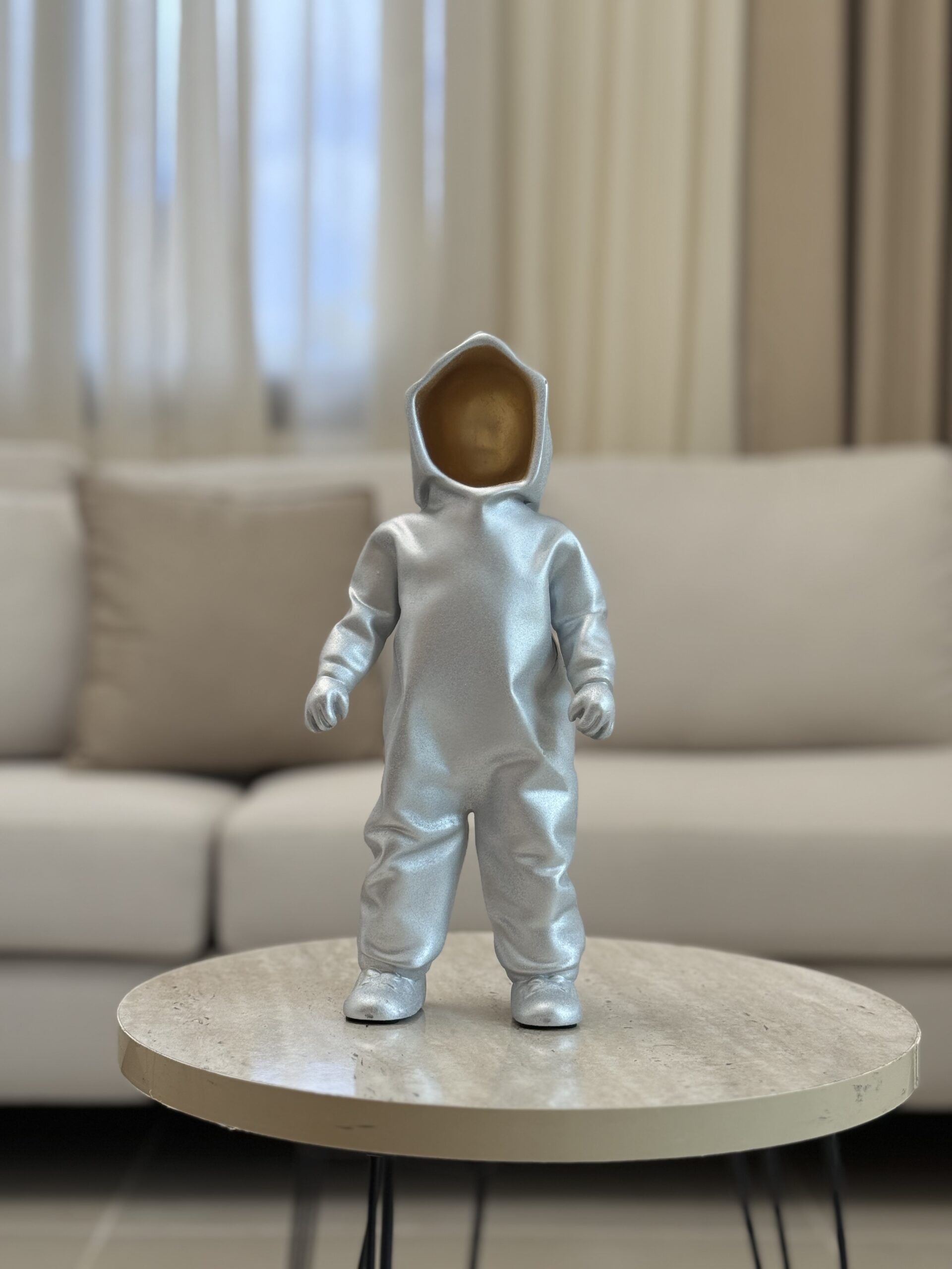 A modern faceless sculpture in a white hoodie with a golden face, blending minimalism and elegance — a unique statement piece for your home décor.