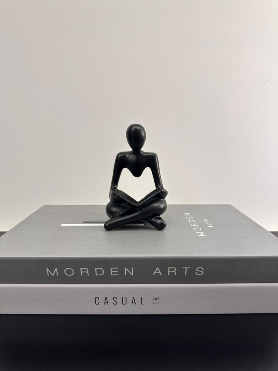 A modern resin sculpture of a seated figure with crossed legs, fully absorbed in a book. Both hands rest gently on the open pages, while the abstract design leaves the torso intentionally undefined. A stylish tribute to quiet moments and the love of reading.