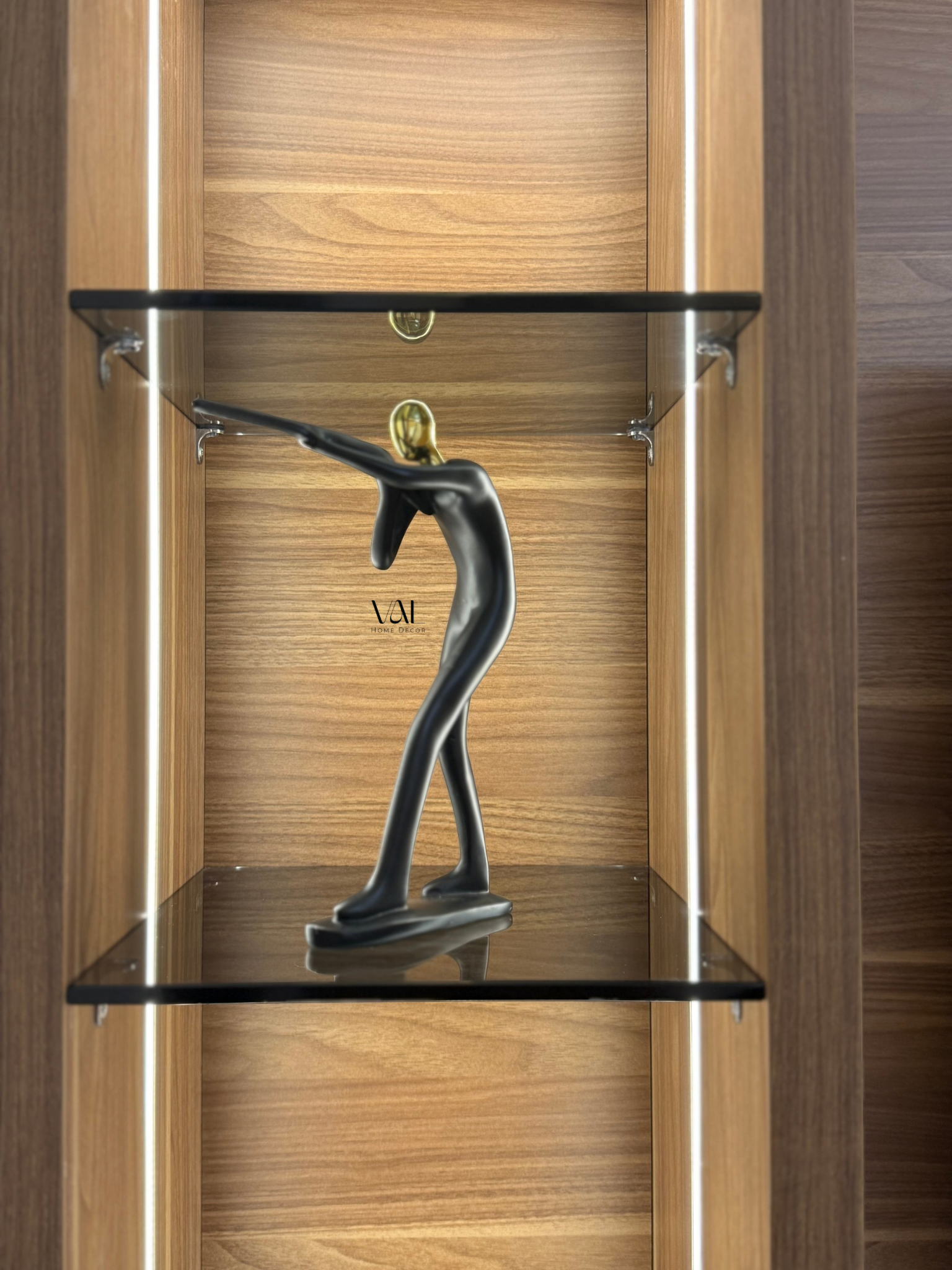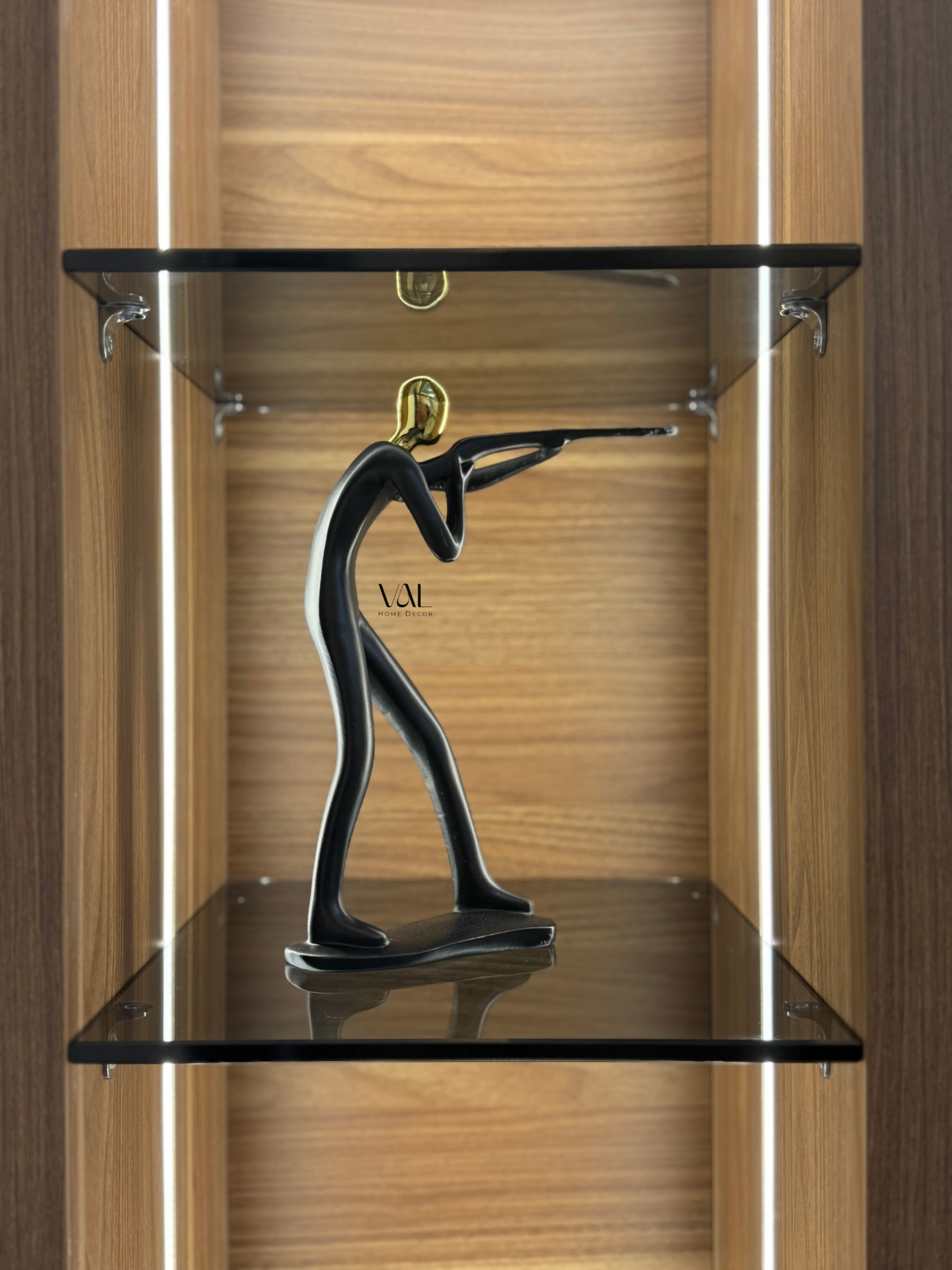 A sleek, modern resin sculpture in matte black with a golden head — symbolizing ambition and forward motion. Its dynamic pose adds energy and elegance to any interior space.