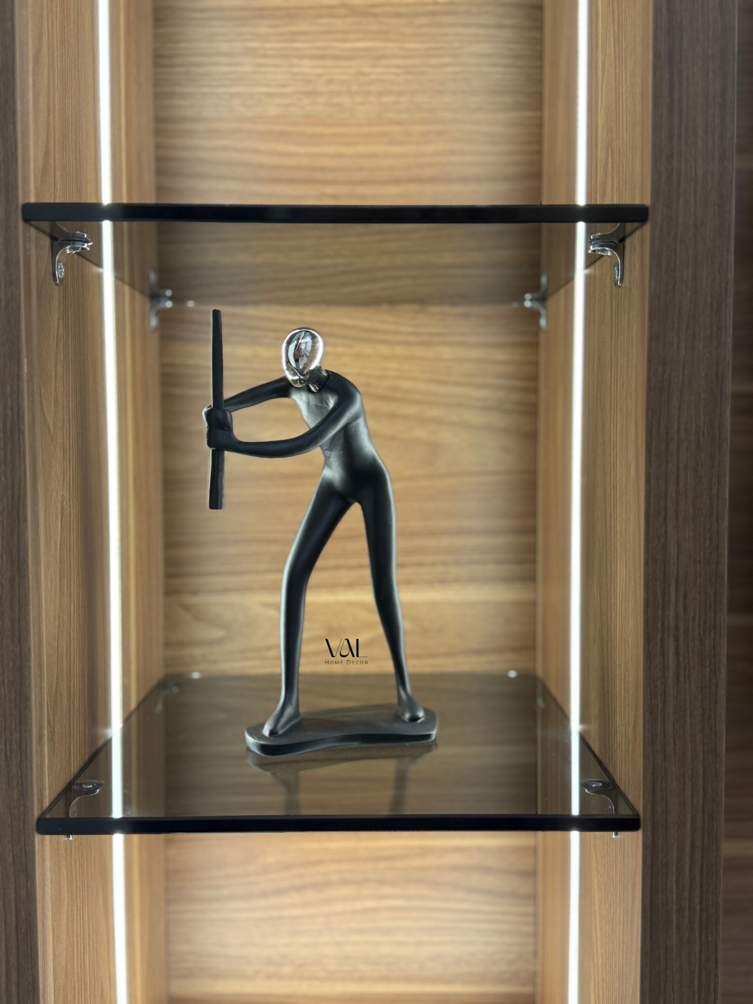 Elegant resin sculptures in matte black with striking metallic faces — one in gold, one in silver. These abstract figures represent focus and determination, making them a bold statement piece for any modern space.
