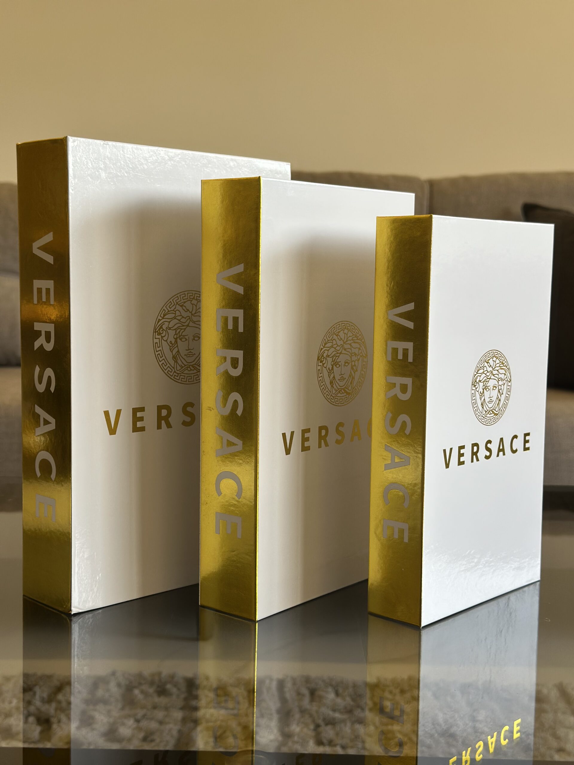 This luxurious set of 3 decorative books features a sleek Versace-inspired design with elegant white covers and stunning gold foil spines. Perfect for styling coffee tables, shelves, or modern interiors, these decorative accents bring a sophisticated touch of high-fashion elegance to any space.