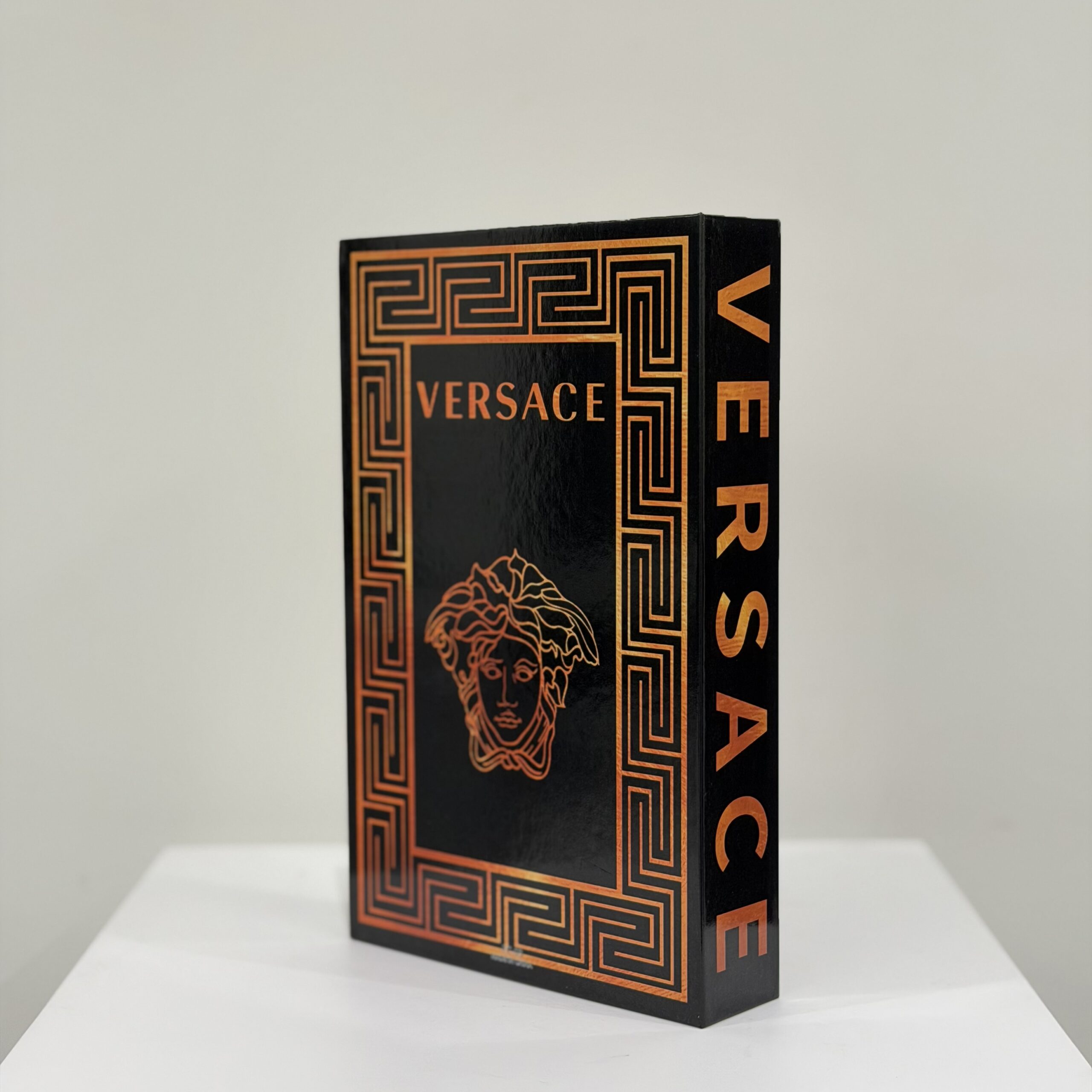 An elegant black Versace box adorned with a striking orange Greek key border and the signature Medusa emblem at its center, giving it a modern and luxurious look.
