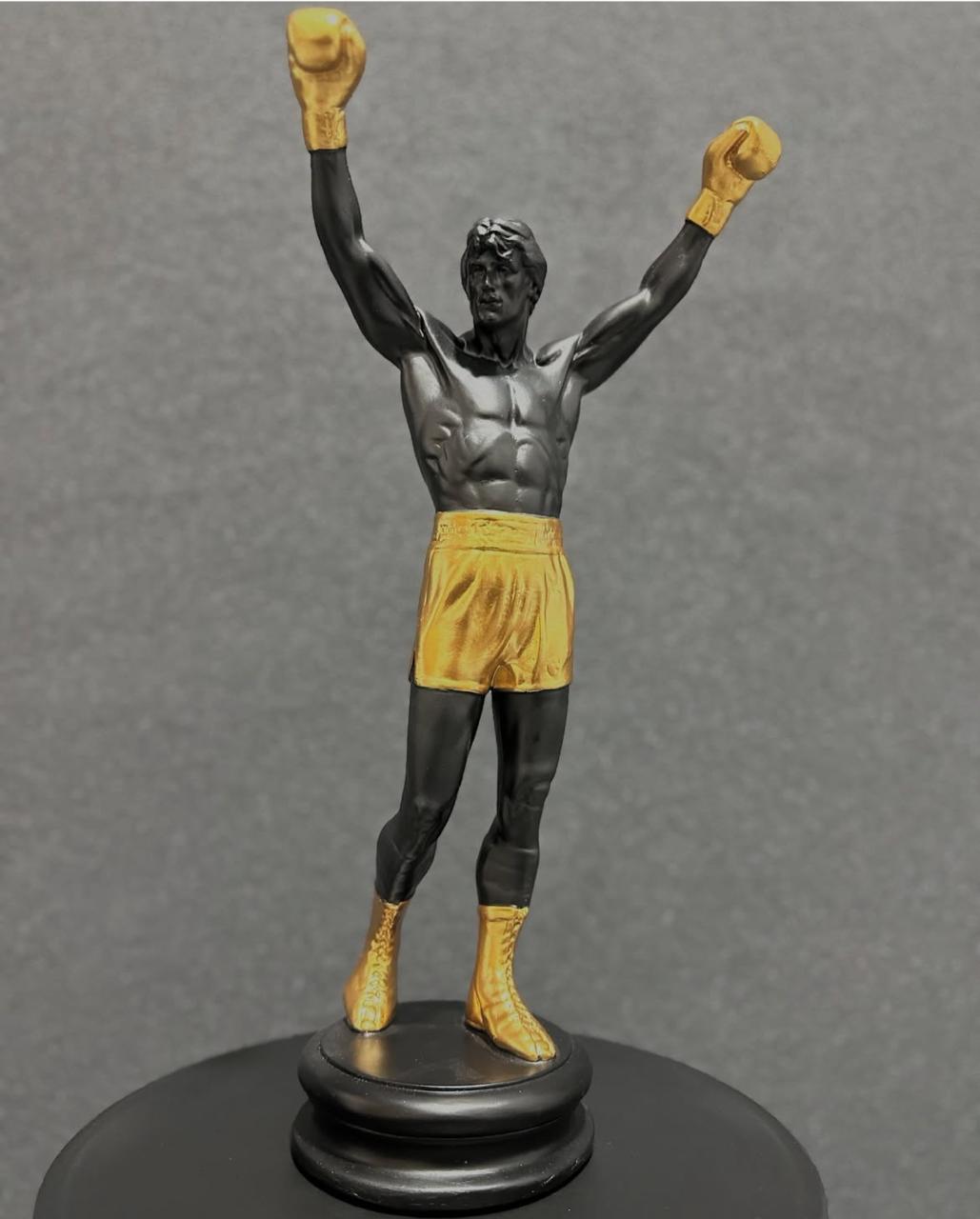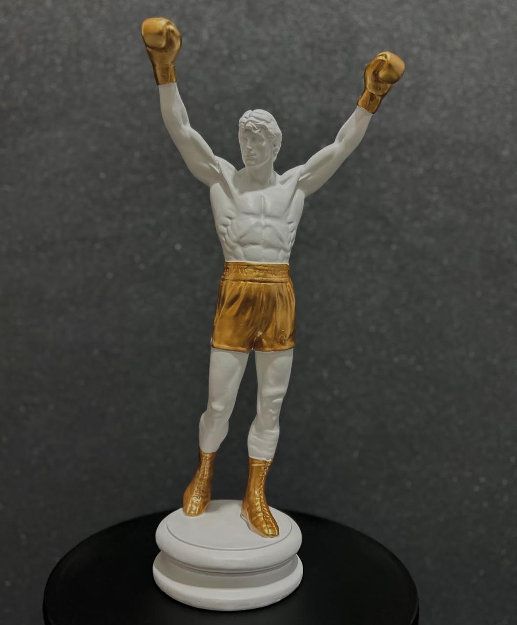 A dynamic resin sculpture of a triumphant boxer, clad in gold gloves and shorts, hands raised high in a victorious pose. Bold and powerful, it’s a striking tribute to strength, resilience, and the spirit of a champion.