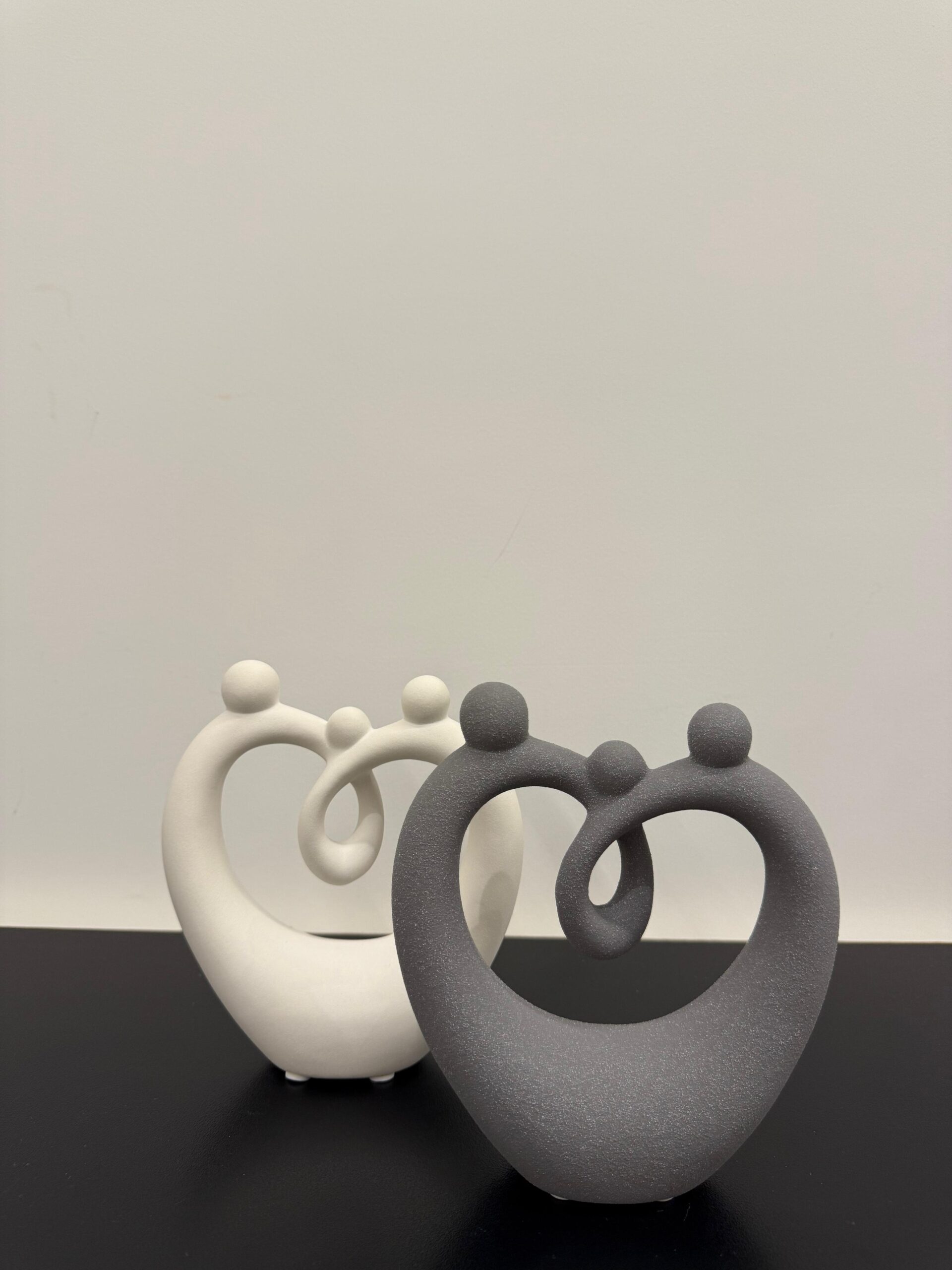 This elegant grey ceramic sculpture features an abstract design of three figures intertwined in a heart-like shape, symbolizing family’s love and connection.